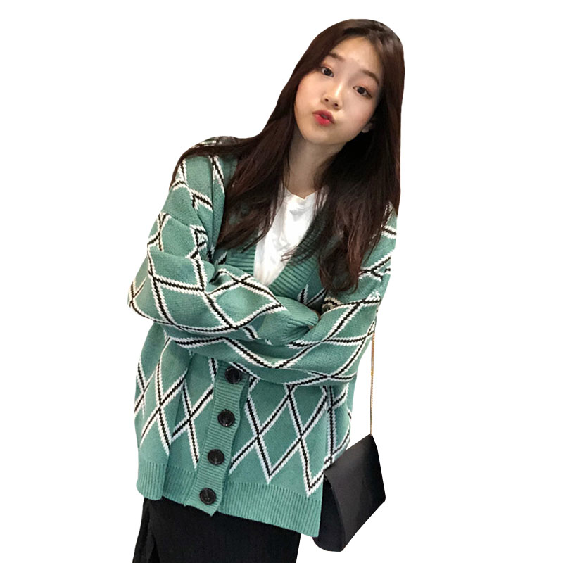 / 秋冬2018新款韓版慵懶風菱格寬松中長款網紅針織衫毛衣開衫外套女