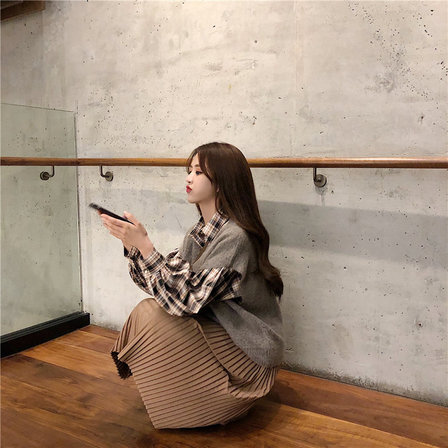 / 韓版時尚休閑套裝秋季女裝中長款格子襯衣+針織馬甲+百褶裙三件套