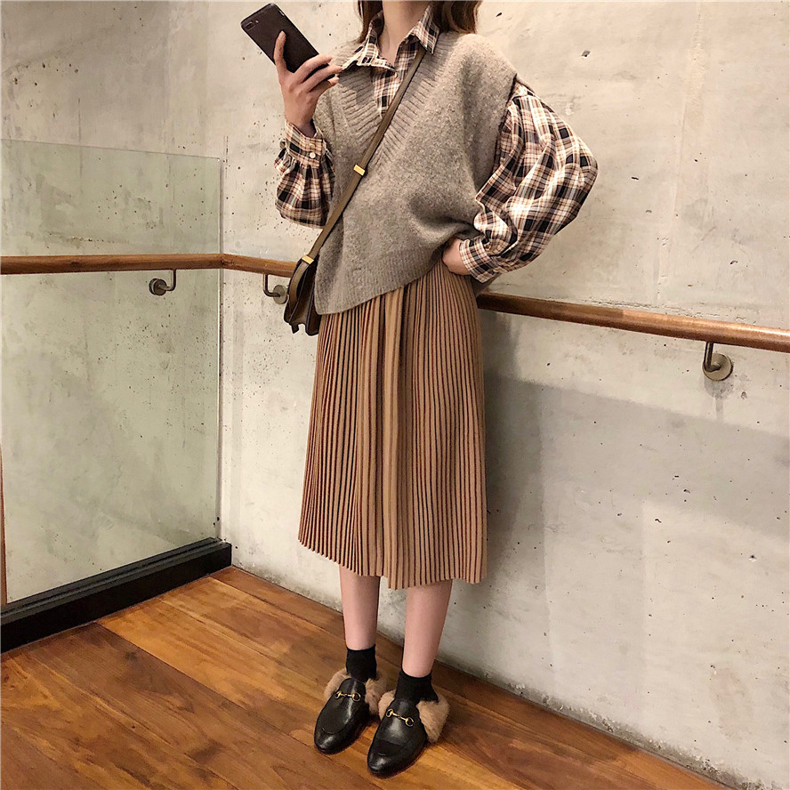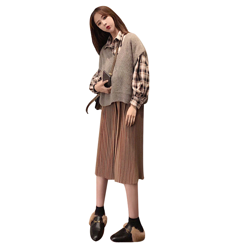韓版時尚休閑套裝秋季女裝中長款格子襯衣+針織馬甲+百褶裙三件套