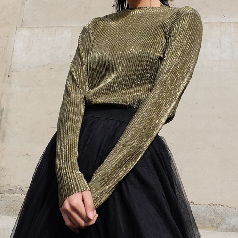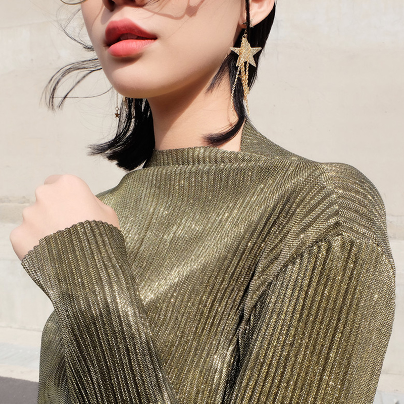 / 早秋新款韓版女裝修身閃閃亮片長袖T恤上衣顯瘦金屬半高領打底衫