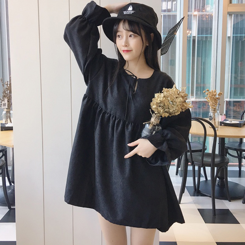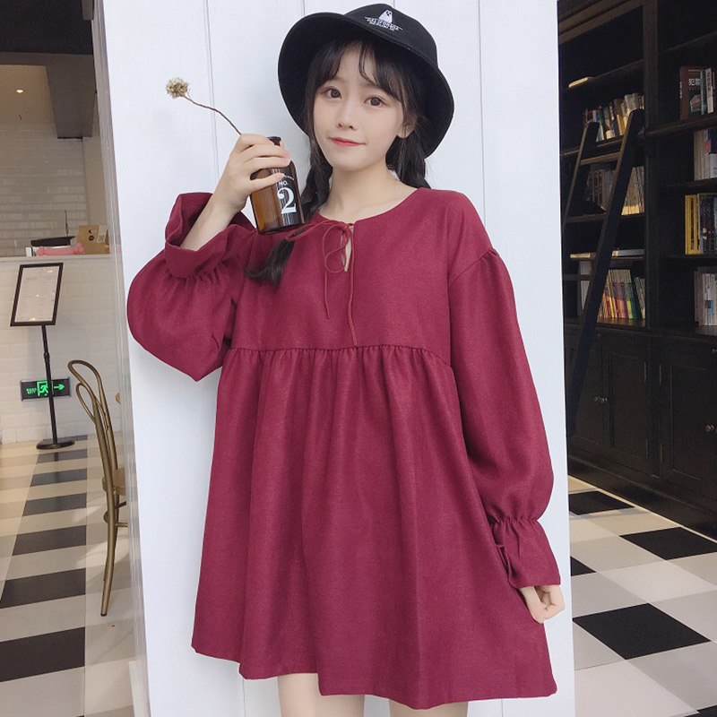 春秋新款女裝韓版小清新領口系帶寬松喇叭袖長袖連衣裙娃娃中長裙