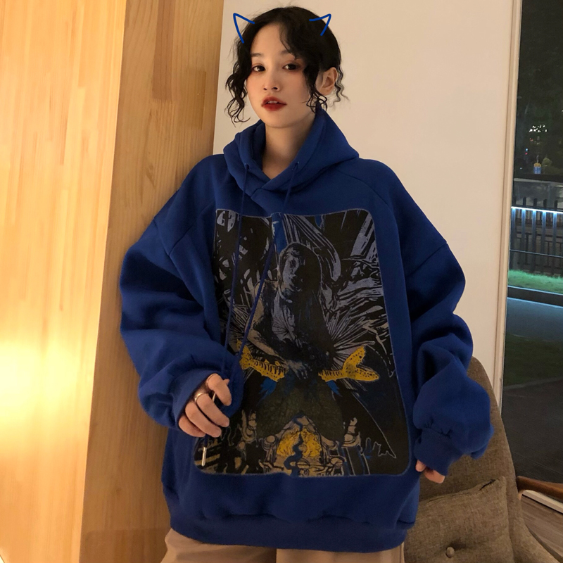 秋冬韓版中長款慵懶風寬松原宿風涂鴉加絨加厚連帽衛衣上衣外套女
