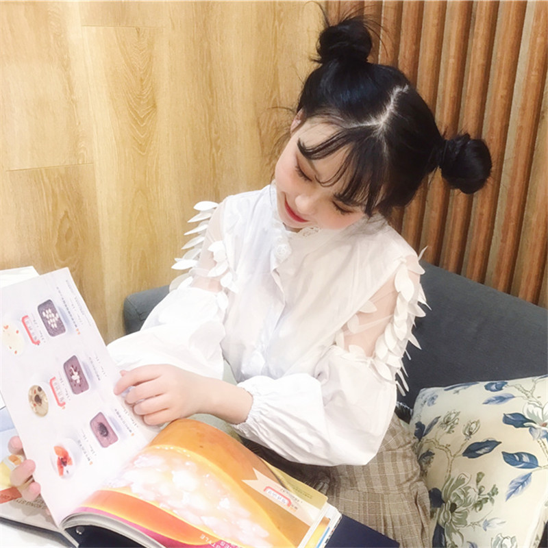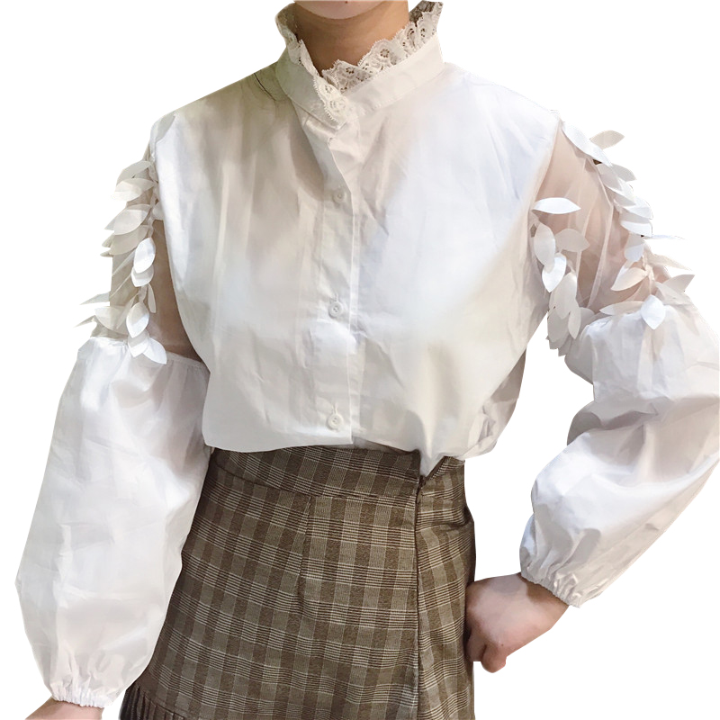 / 早秋新款女裝甜美立領網紗拼接寬松顯瘦樹葉花燈籠袖學生襯衫上衣