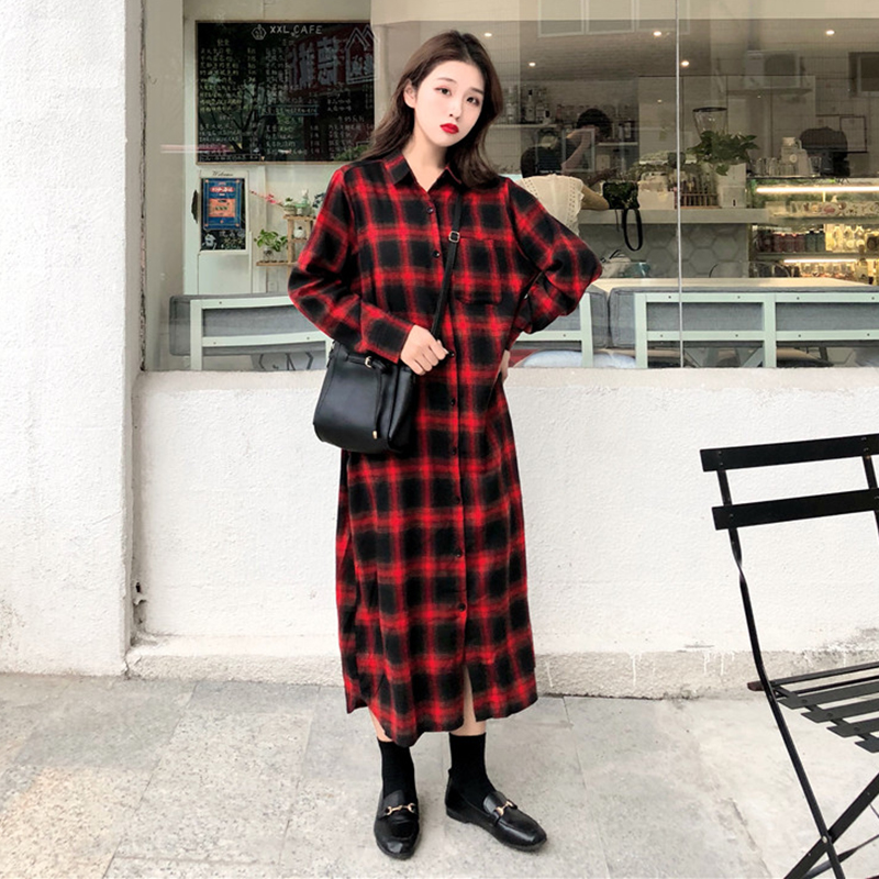 / 秋季女裝韓版港味休閑寬松顯瘦百搭中長款學生長袖格子襯衫外套潮