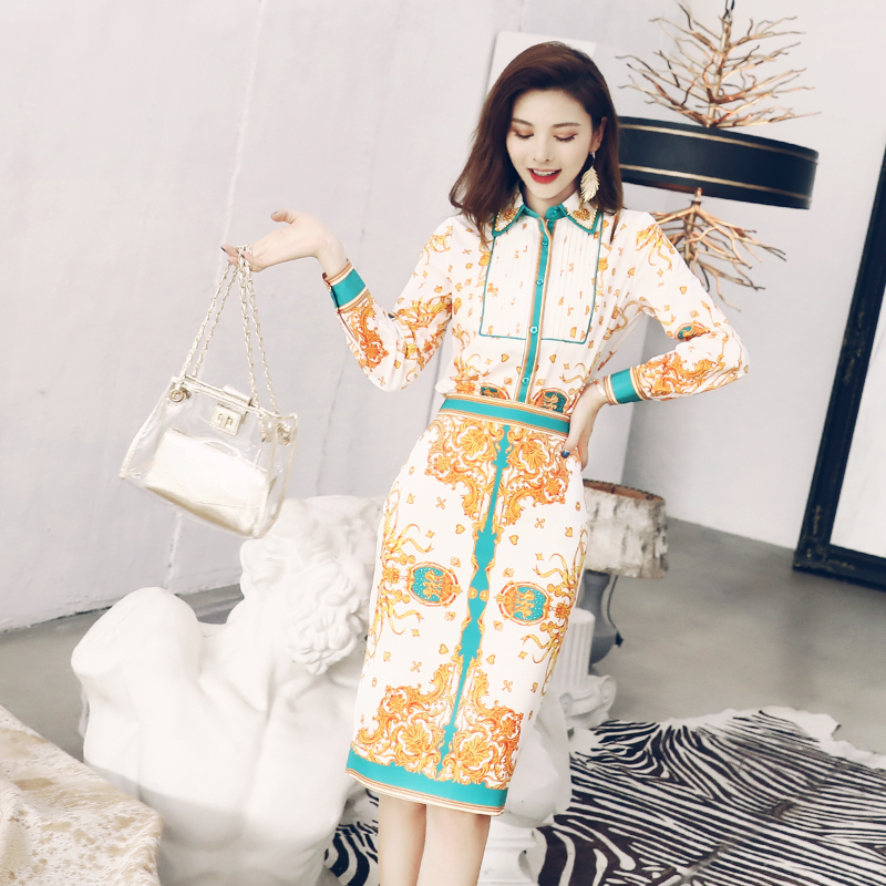 / 套裝裙秋季2018新款長袖襯衫上衣印花半身裙重工復古兩件套連衣裙