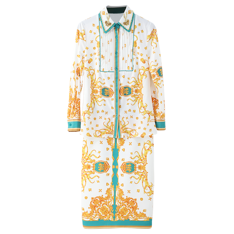 套裝裙秋季2018新款長袖襯衫上衣印花半身裙重工復古兩件套連衣裙