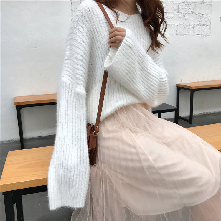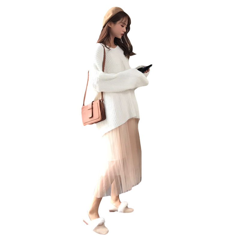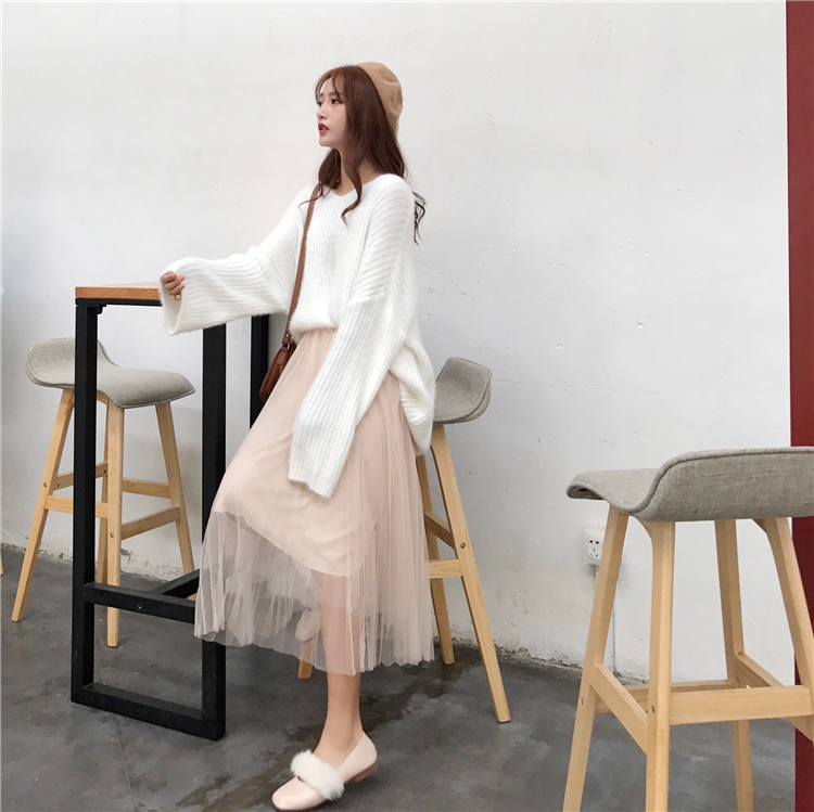 / 韓版時尚休閑套裝秋季女裝中長款馬海毛V領毛衣+網紗半身裙兩件套