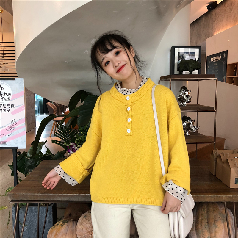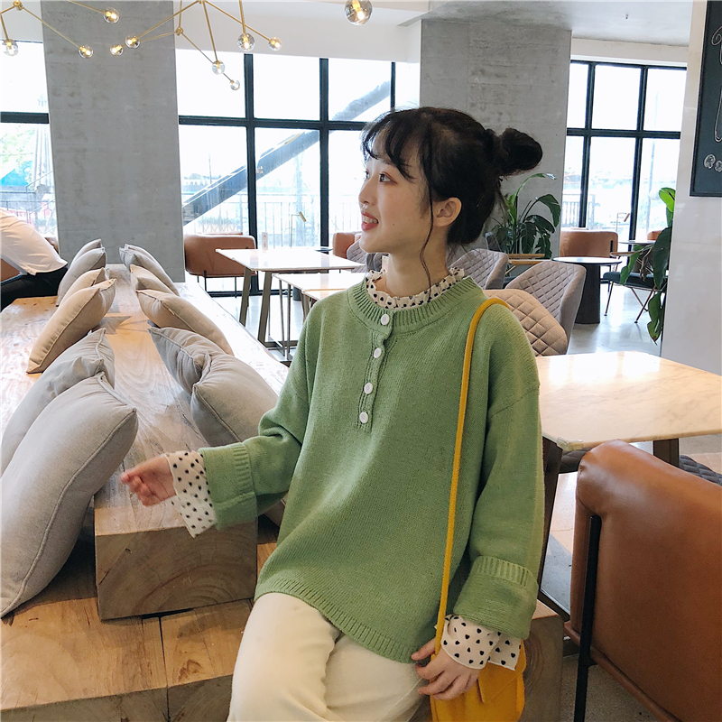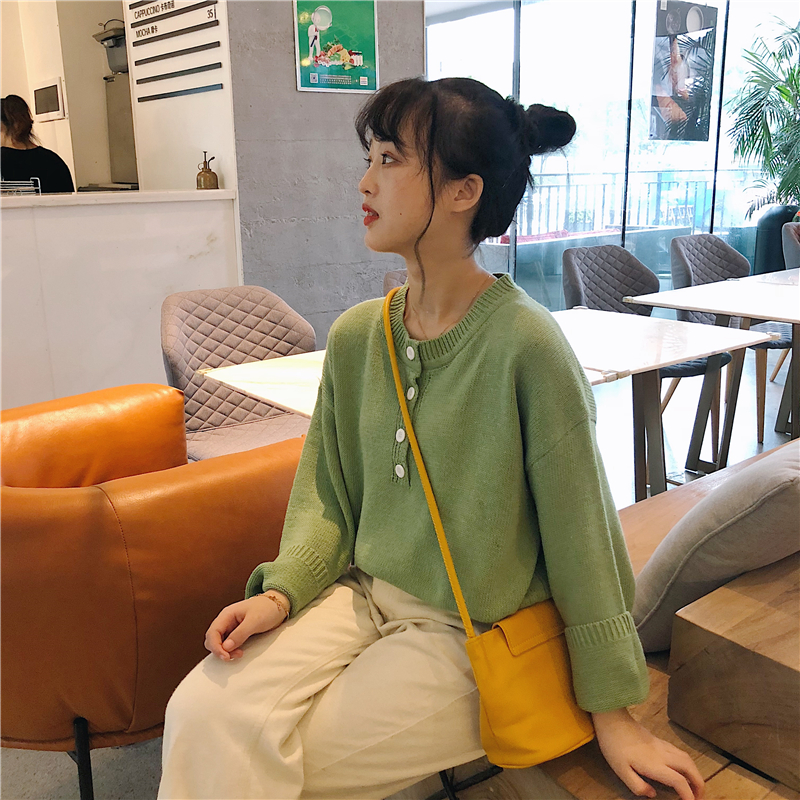 秋冬女裝韓版慵懶風純色甜美圓領紐扣毛衣寬松網紅套頭針織衫外套