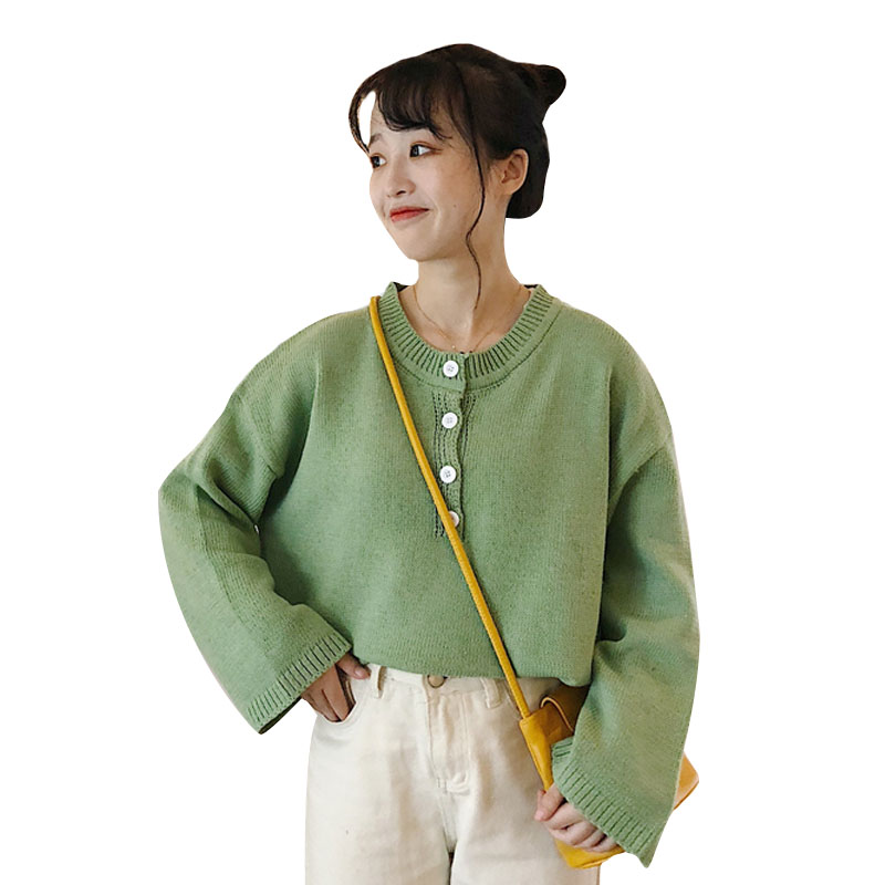 / 秋冬女裝韓版慵懶風純色甜美圓領紐扣毛衣寬松網紅套頭針織衫外套