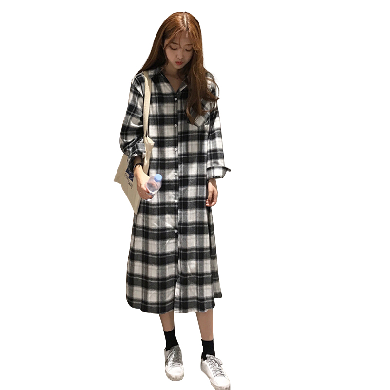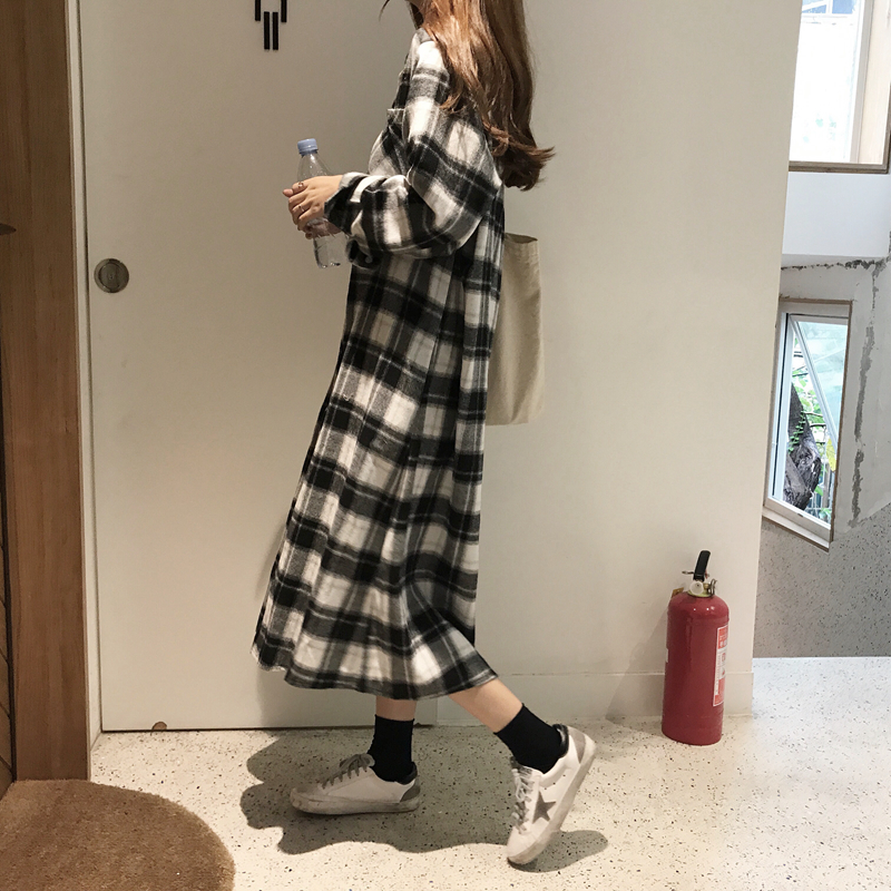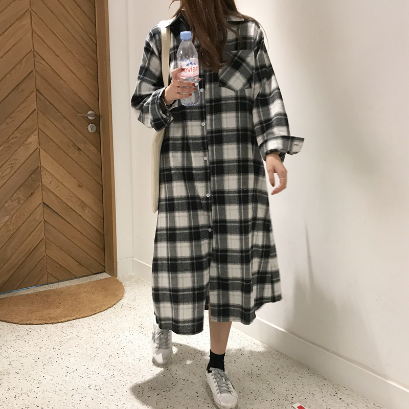 / 秋裝女裝新款韓版寬松翻領磨毛側開叉中長款長袖襯衫裙休閑襯衣潮