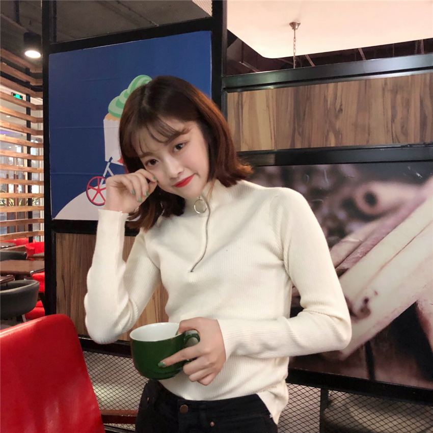 秋冬女裝韓版chic拉鏈半高領修身顯瘦打底毛衣長袖針織衫上衣外套