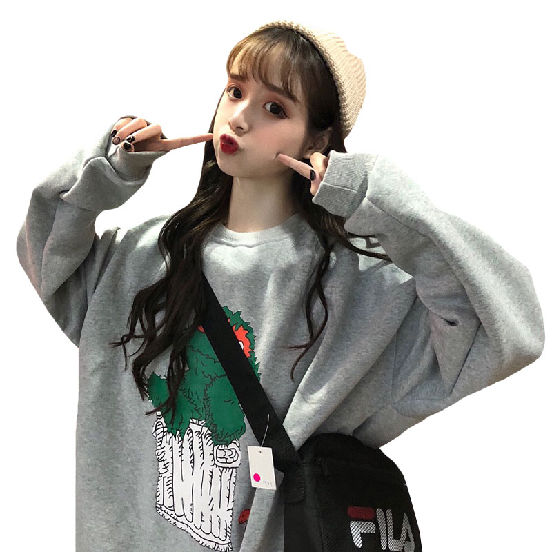 / 2018新款秋冬女裝韓版中長款寬松慵懶風卡通加絨加厚套頭衛衣外套