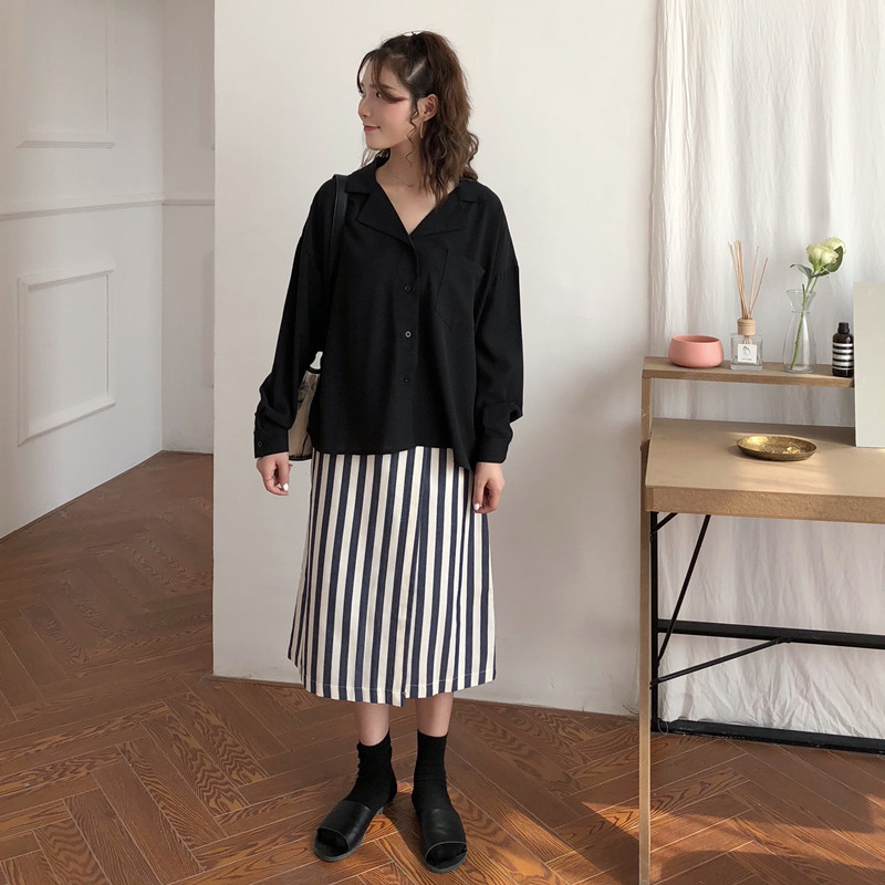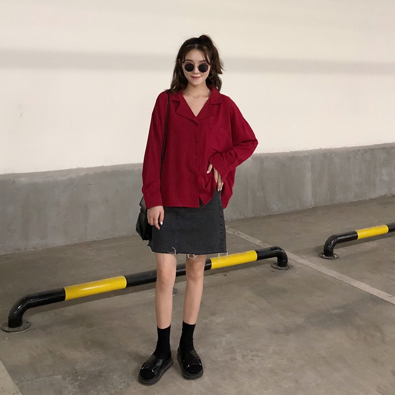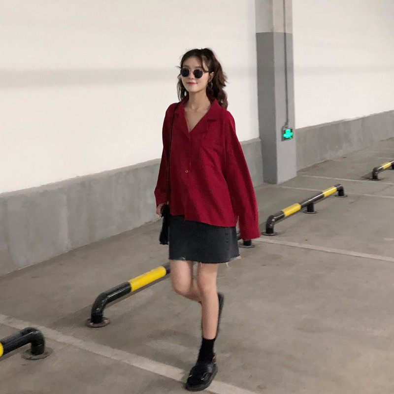 / 秋季女裝韓版復古氣質純色長袖襯衫翻領寬松休閑襯衣chic風上衣潮