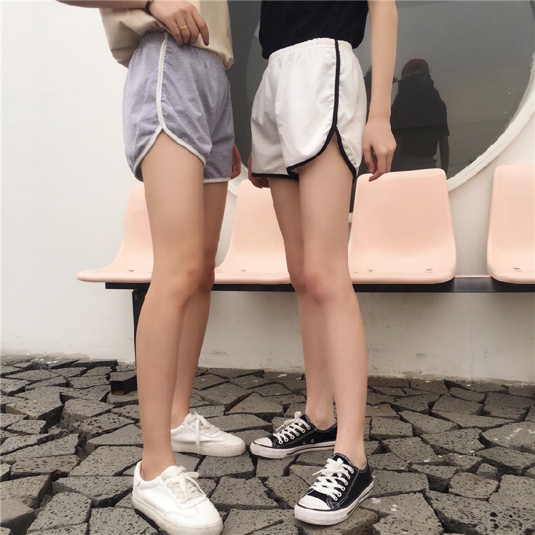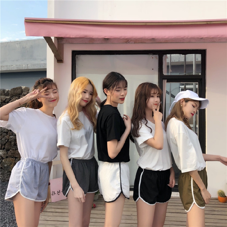 / 夏裝女裝韓版簡約拼色休閑運動短褲闊腿褲高腰外穿休閑褲直筒褲潮