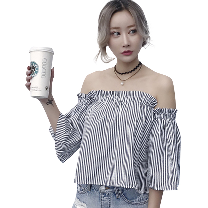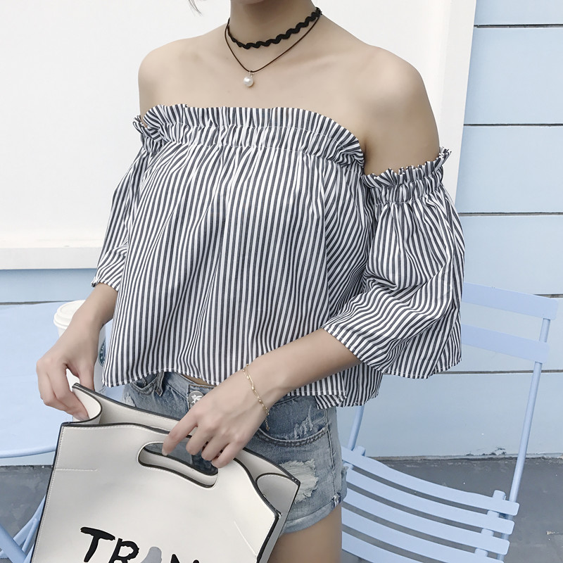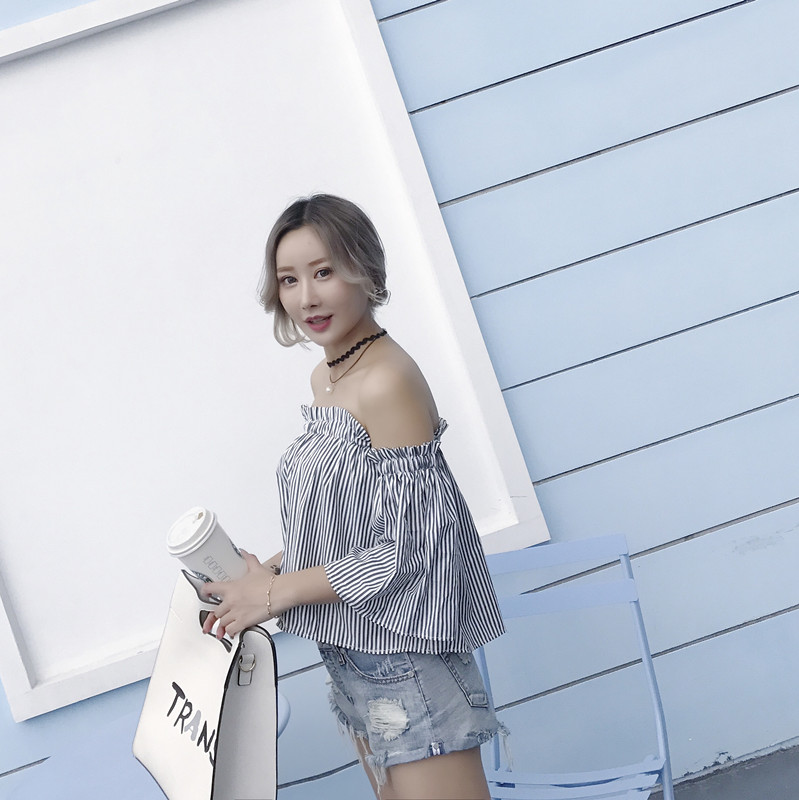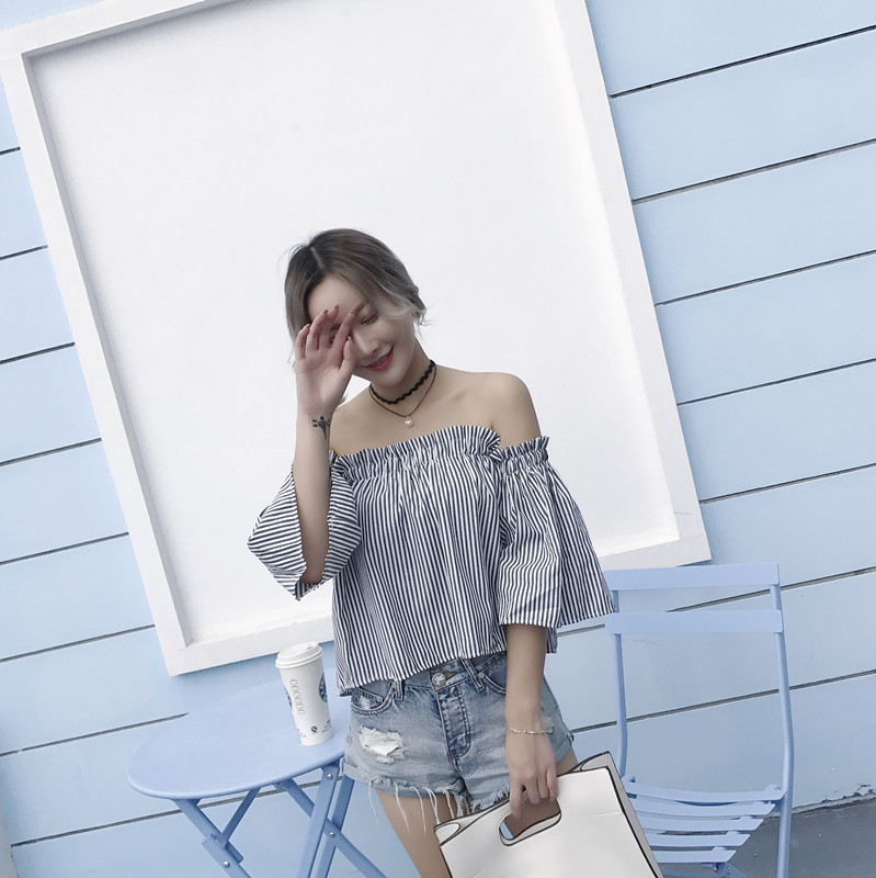 / 早春新款女裝韓版復古條紋一字領露肩寬松顯瘦學生短袖襯衫上衣女