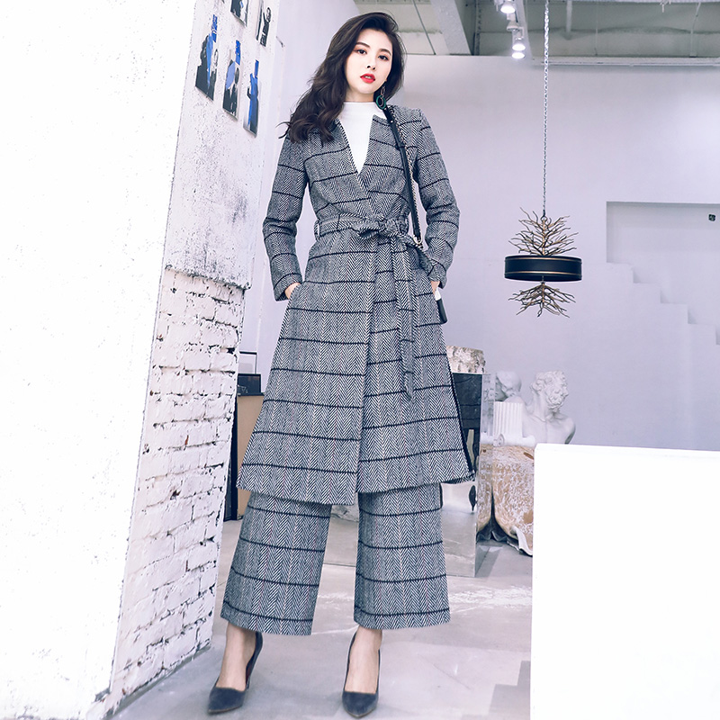 / 名媛氣質2018新款毛呢套裝女秋裝時尚顯瘦闊腿褲長系帶外套冬