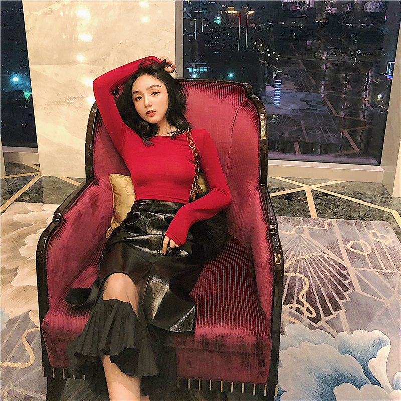 / 性感百搭高腰pu皮裙半身裙長裙短款露臍上衣打底衫韓版時尚套裝女