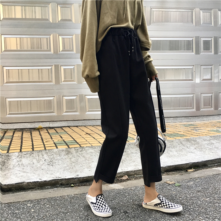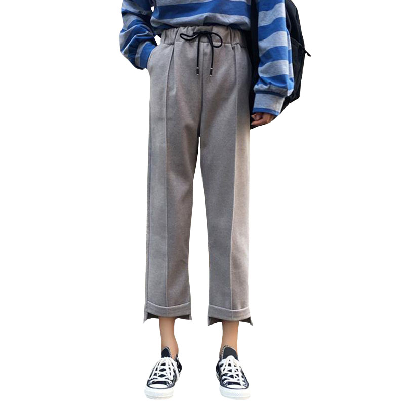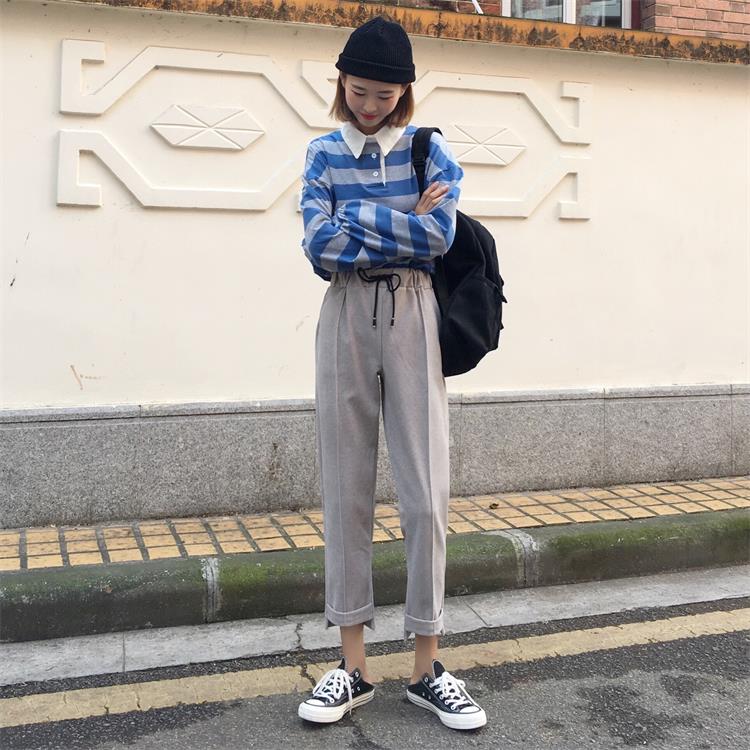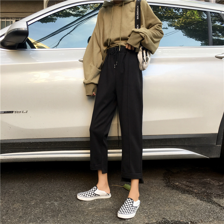 / 秋季女裝韓版松緊腰系帶工裝褲直筒褲高腰顯瘦闊腿褲休閑褲九分褲