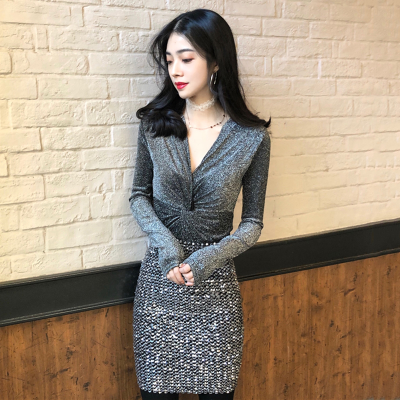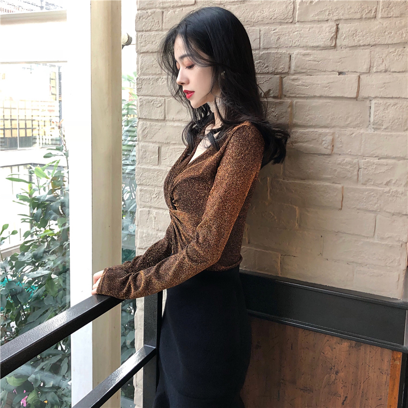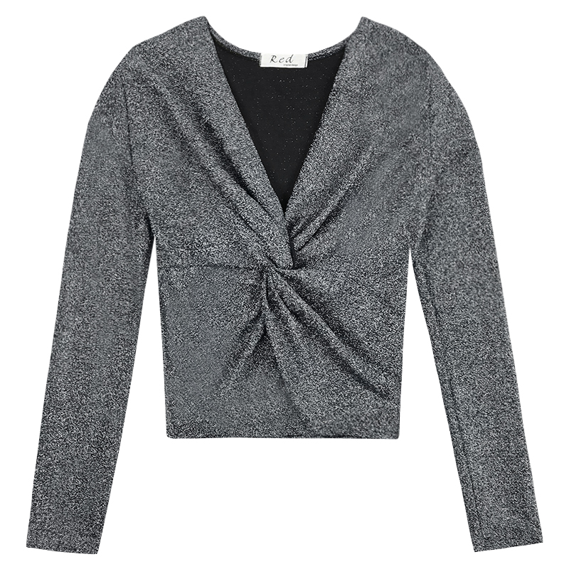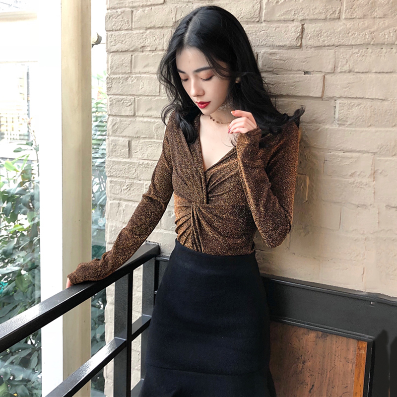秋裝女2018新款復古氣質修身V領短款T恤休閑時尚亮絲長袖打底上衣