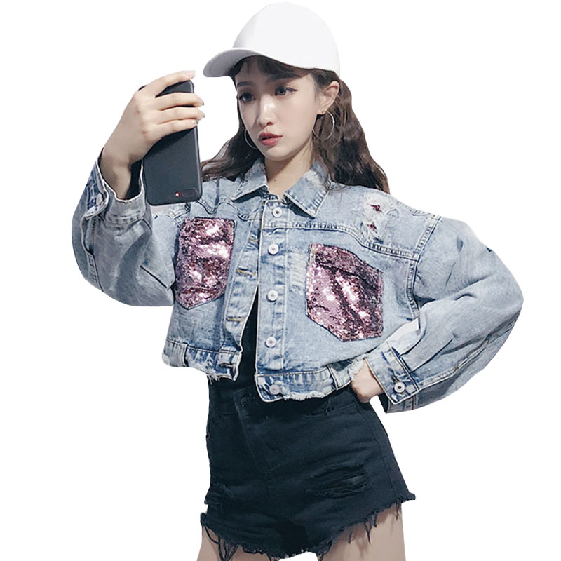 / 秋季韓版重工口袋亮片破洞牛仔衣短款寬松長袖開衫夾克上衣外套女