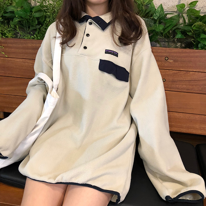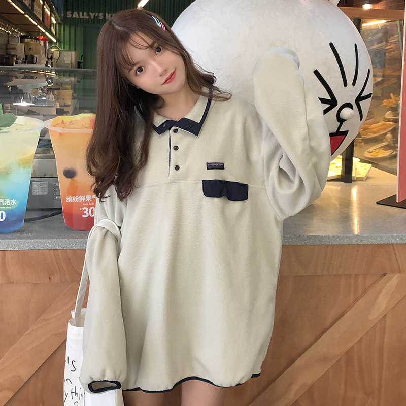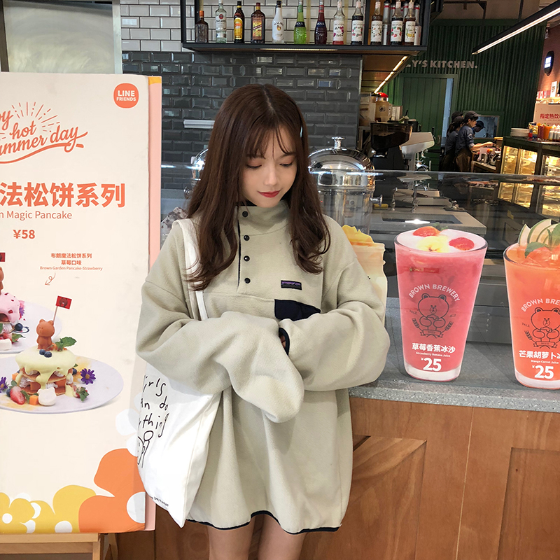 / 可可里小姐~冬季女裝新款寬松拼色中長款加厚毛絨衛衣外套女