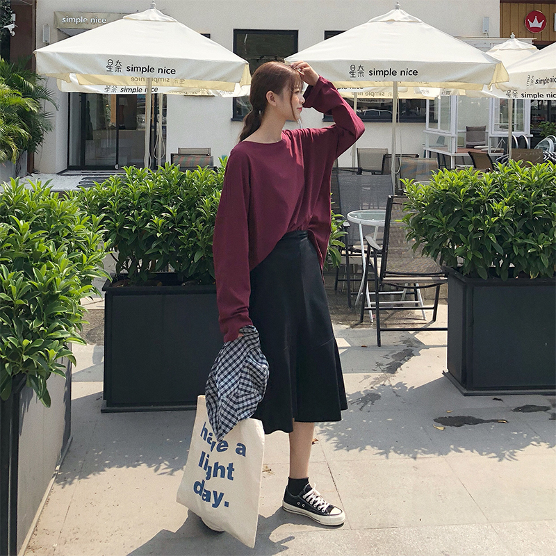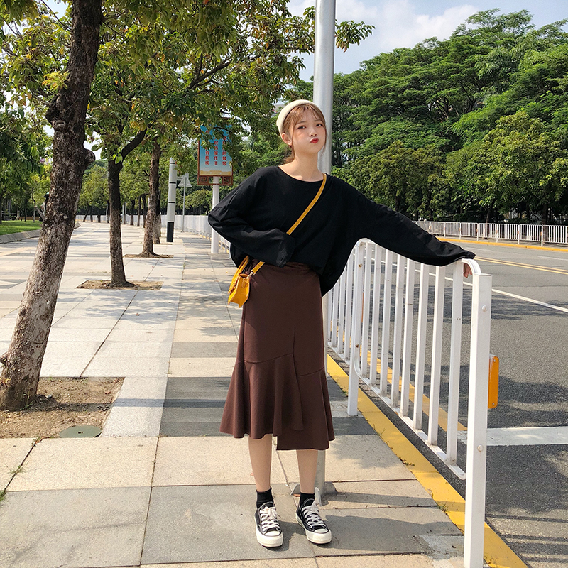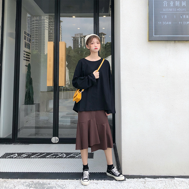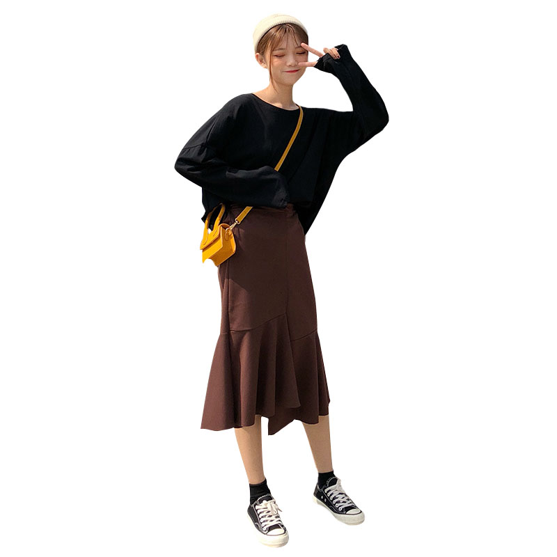 / 韓版時尚休閑套裝秋季純色長袖T恤+高腰不規則半身裙長裙兩件套女