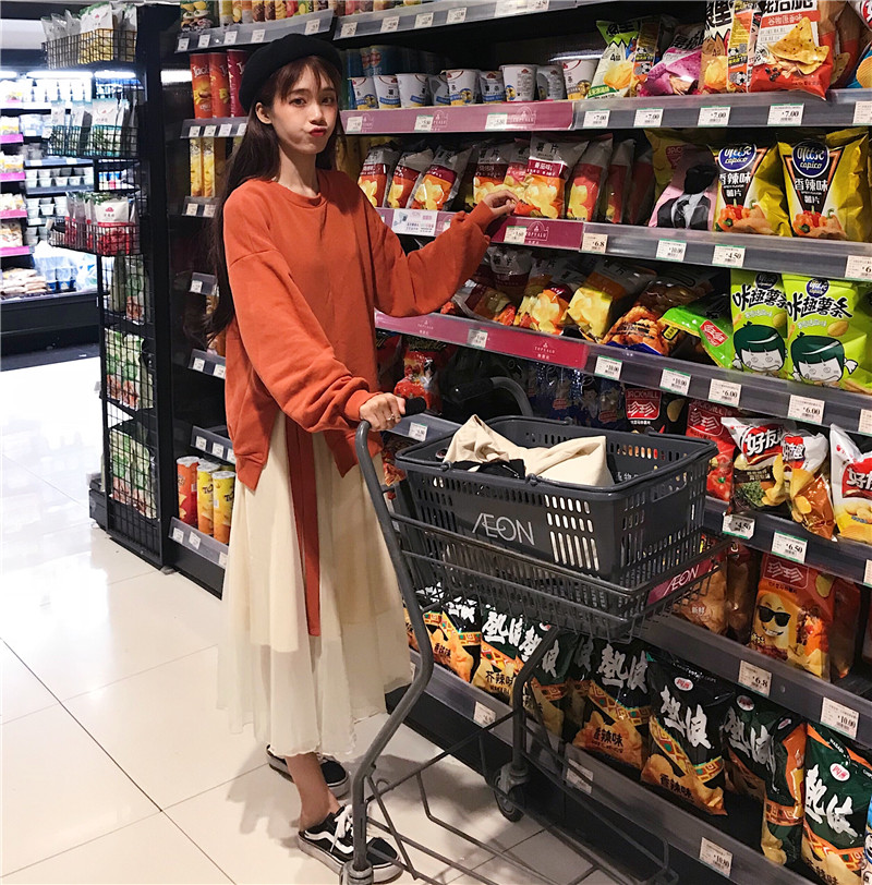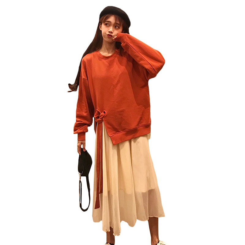 / 韓版時尚休閑套裝秋季chic開叉綁帶衛衣外套+大擺半身裙兩件套女