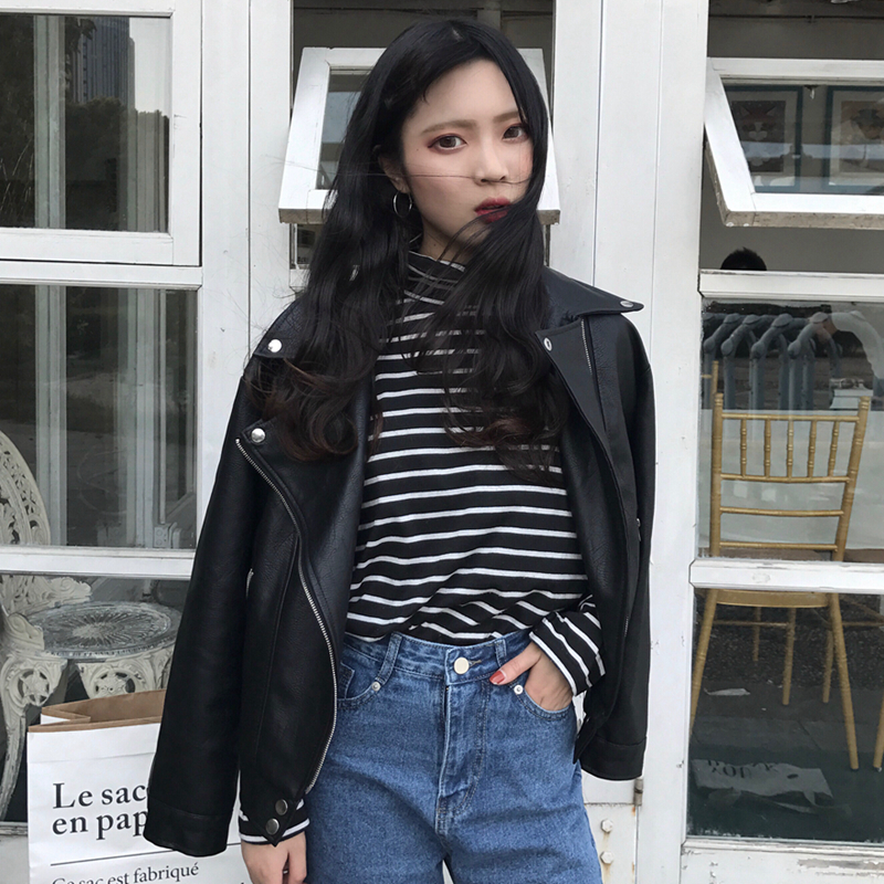 / 秋冬韓版寬松長袖機車服皮衣短款PU皮拉鏈翻領夾克開衫上衣外套女