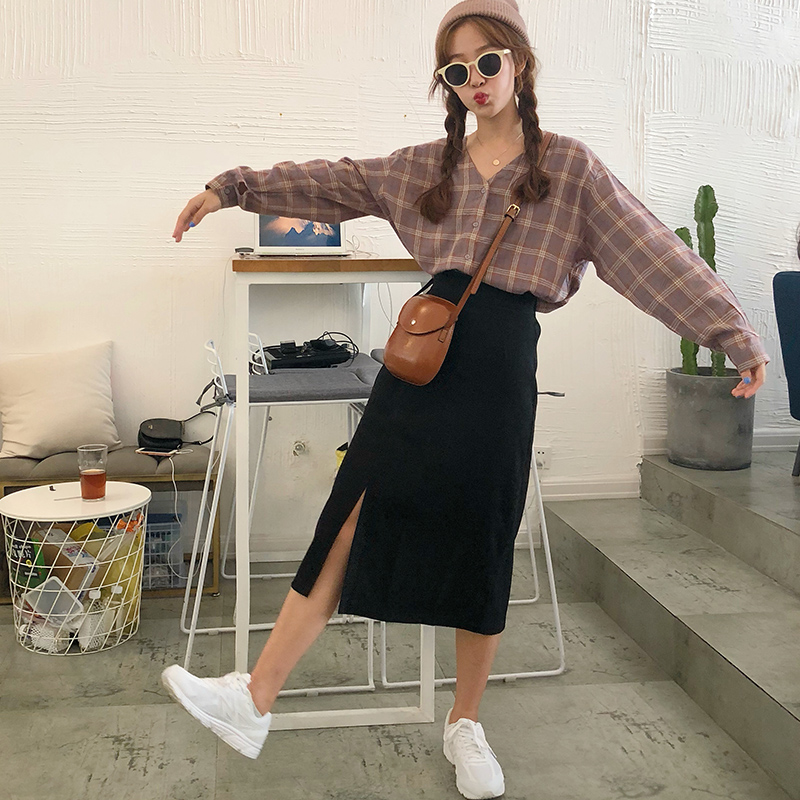 秋季女裝韓版氣質高腰純色開叉半身裙松緊腰顯瘦A字裙包臀裙長裙