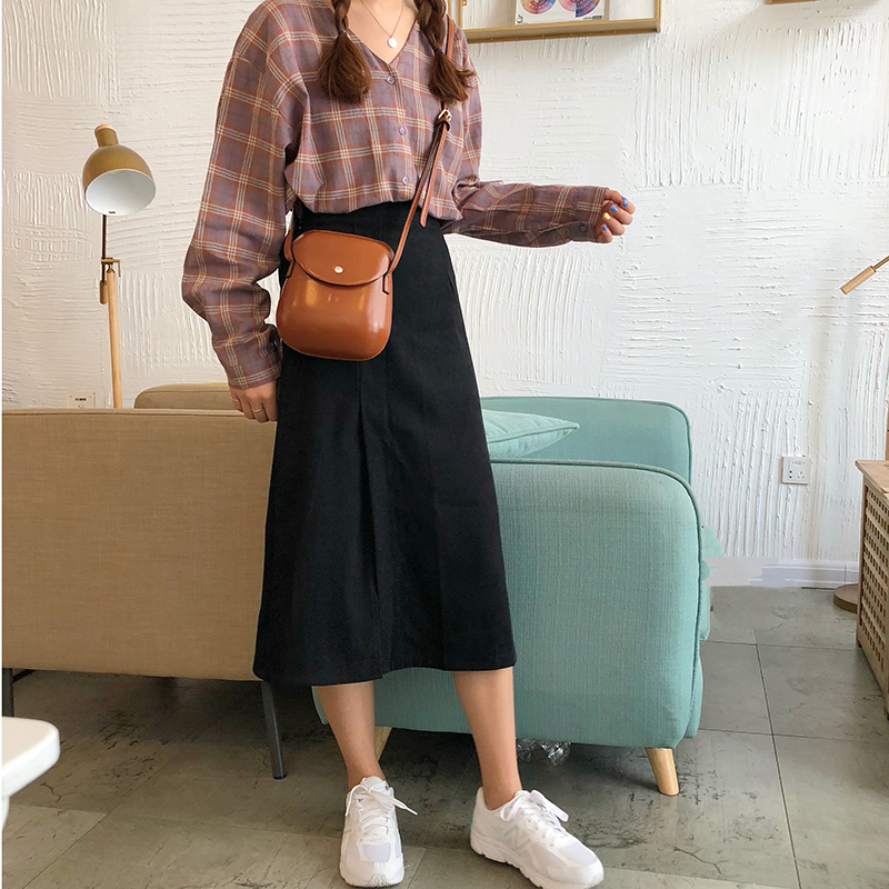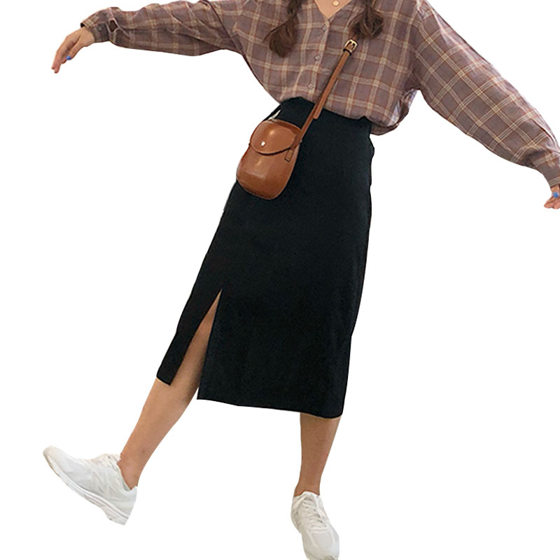/ 秋季女裝韓版氣質高腰純色開叉半身裙松緊腰顯瘦A字裙包臀裙長裙