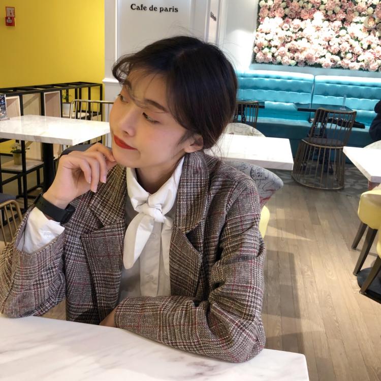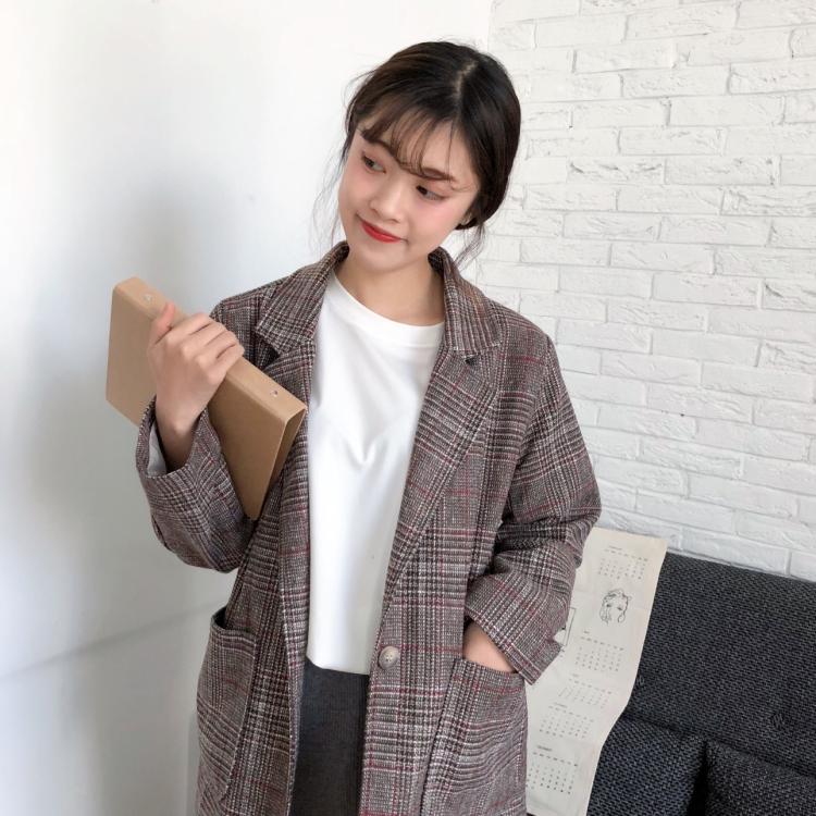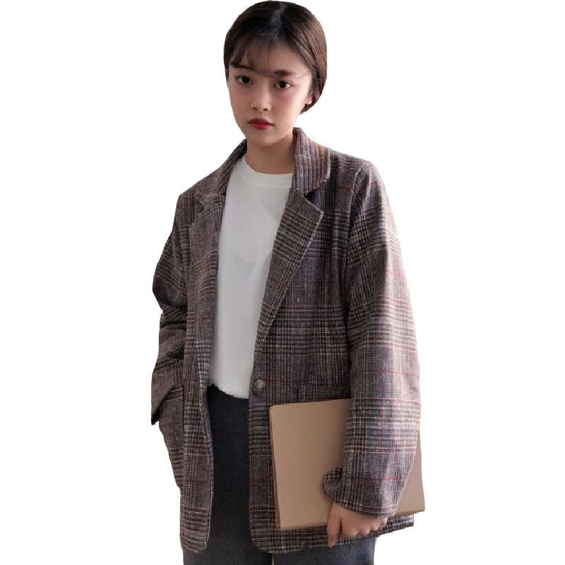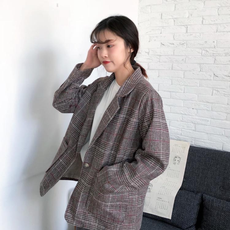 / 秋裝女裝韓版寬松復古英倫格紋一粒扣大翻領西裝學生長袖休閑外套