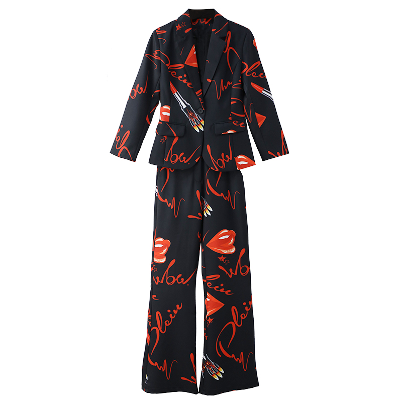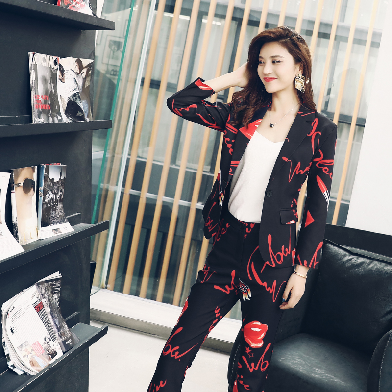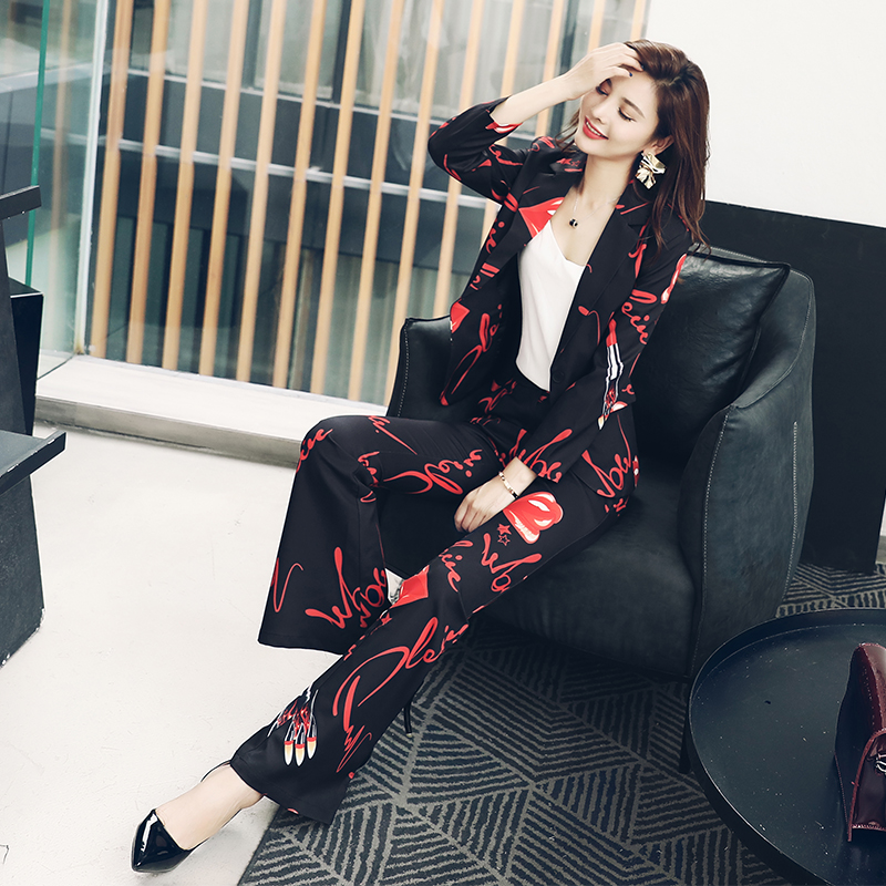印花西裝套裝女秋裝2018新款時尚氣質顯瘦微喇褲復古名媛兩件套潮