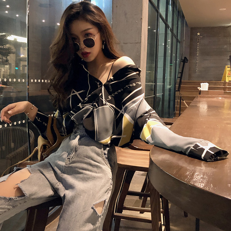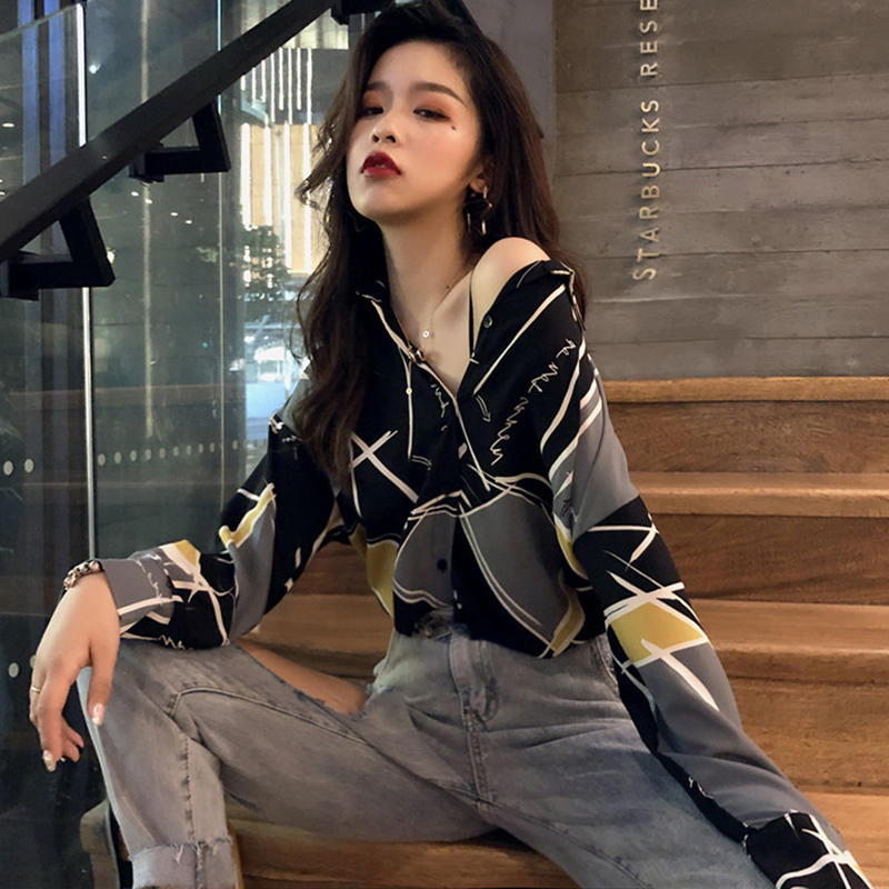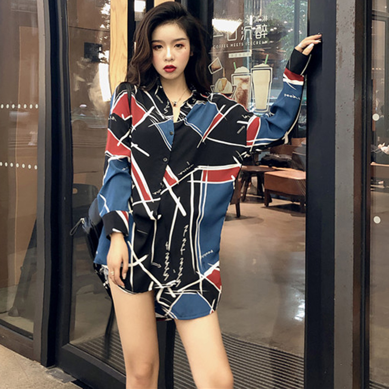 / 早秋2018新款女裝港風個性幾何撞色中長花襯衫時尚寬松長袖上衣潮