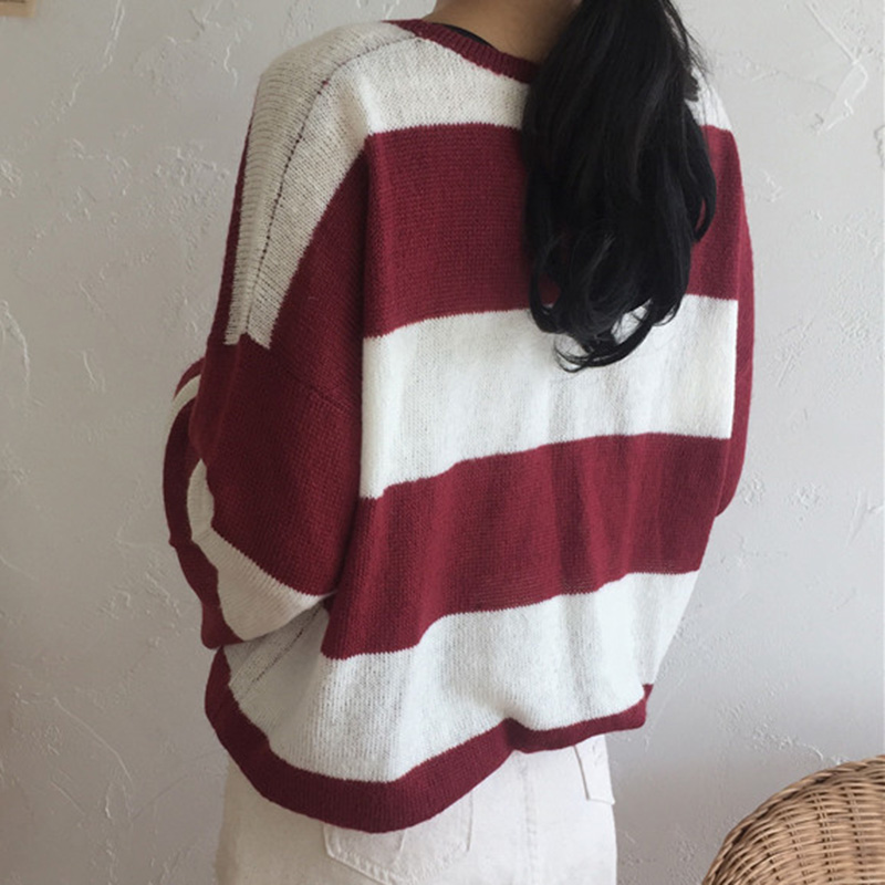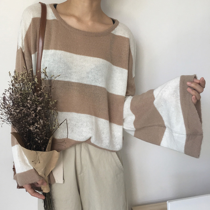 / 港味復古毛衣女2018新款條紋撞色寬松圓領針織衫顯瘦喇叭袖薄上衣