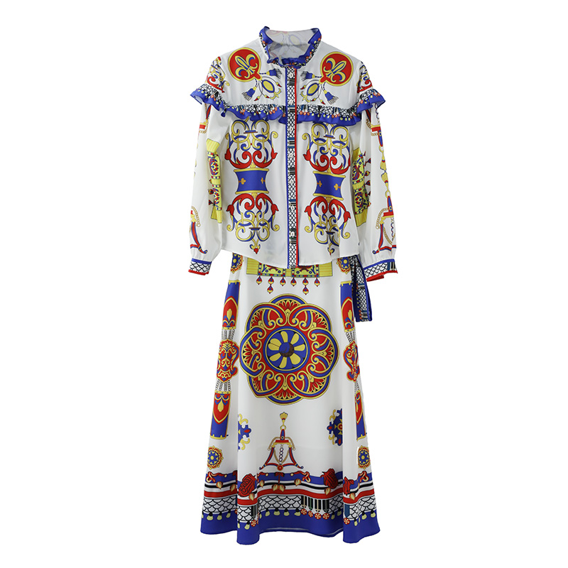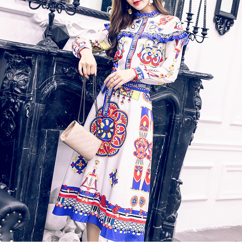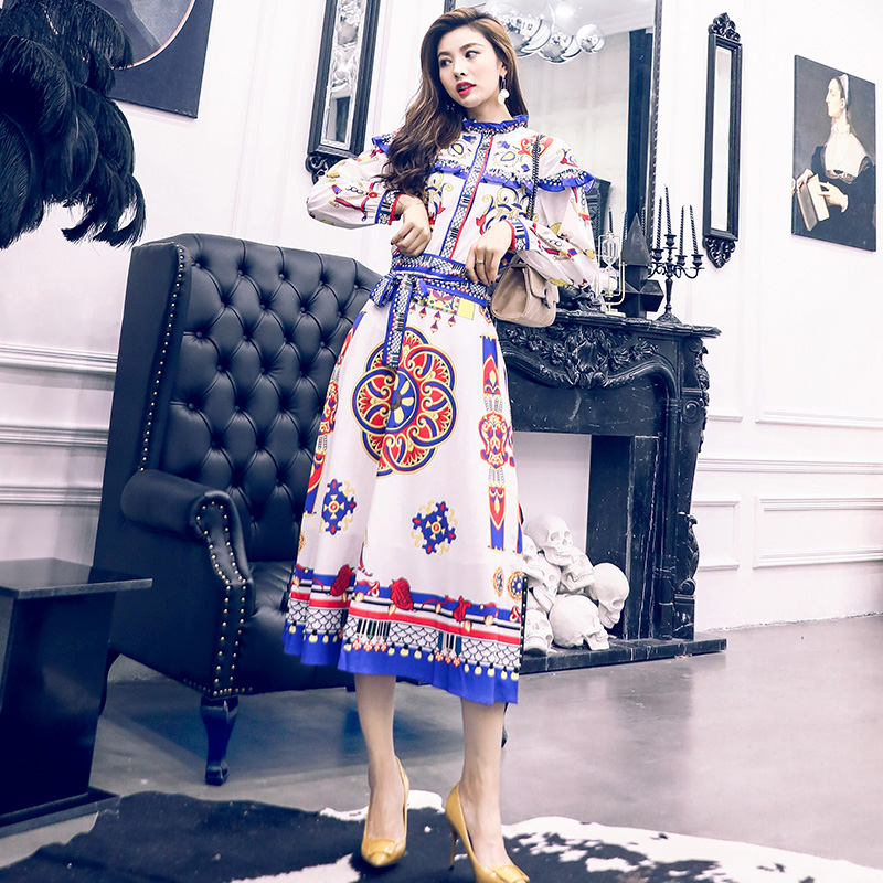 / 名媛氣質2018秋新款時髦襯衫高腰顯瘦洋氣復古印花裙子長款連衣裙