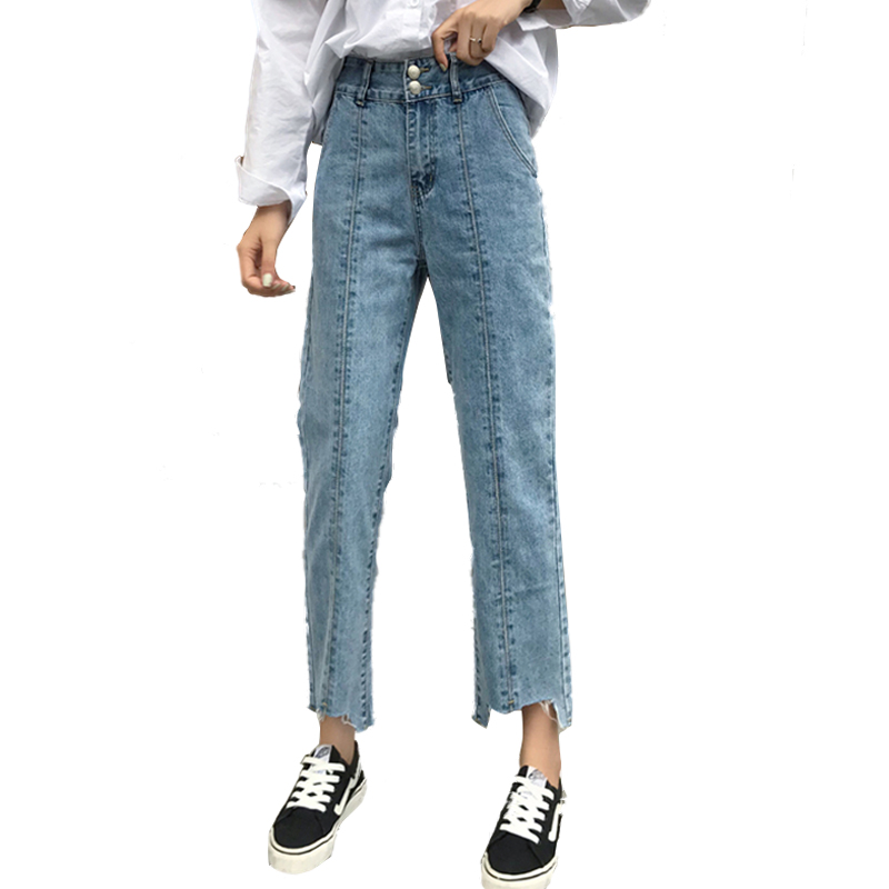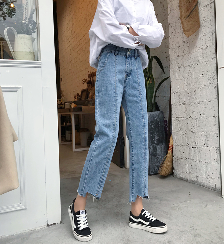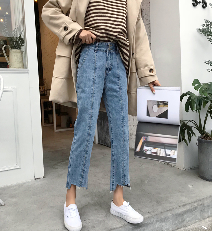 秋裝女裝韓版高腰寬松兩粒扣褲腳缺口九分褲牛仔褲闊腿褲顯瘦長褲