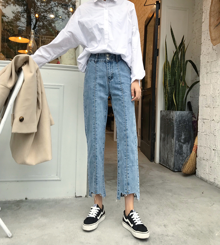 / 秋裝女裝韓版高腰寬松兩粒扣褲腳缺口九分褲牛仔褲闊腿褲顯瘦長褲