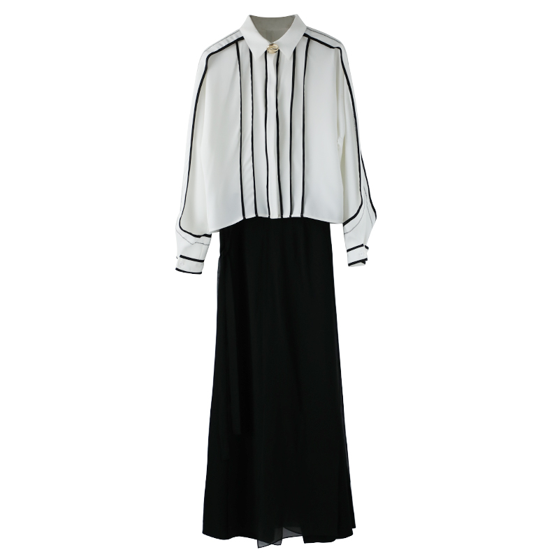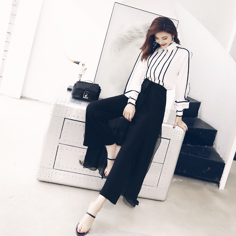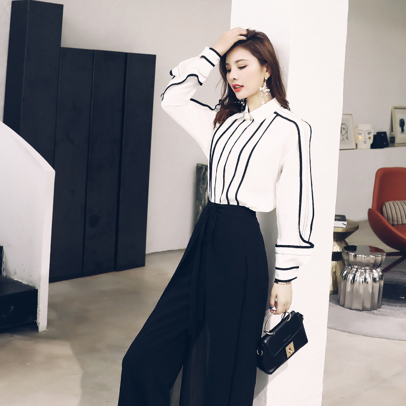 / 名媛氣質兩件套長袖襯衫上衣休閑修身顯瘦網紗闊腿長褲時尚套裝女