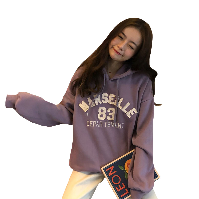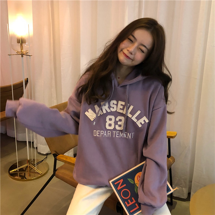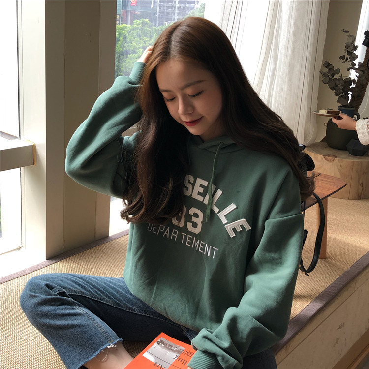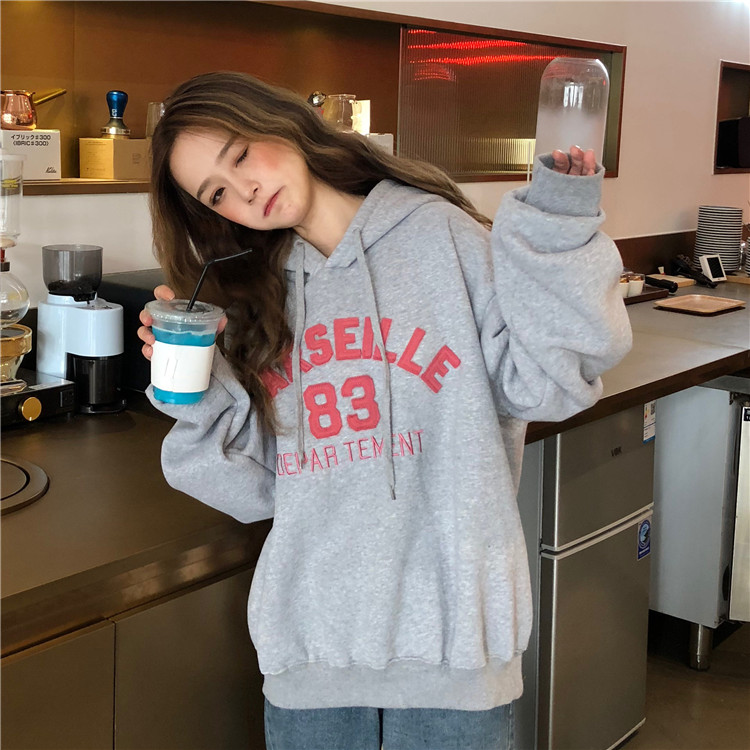 2018新款秋冬韓版原宿風貼布字母刺繡加絨加厚連帽寬松衛衣外套女