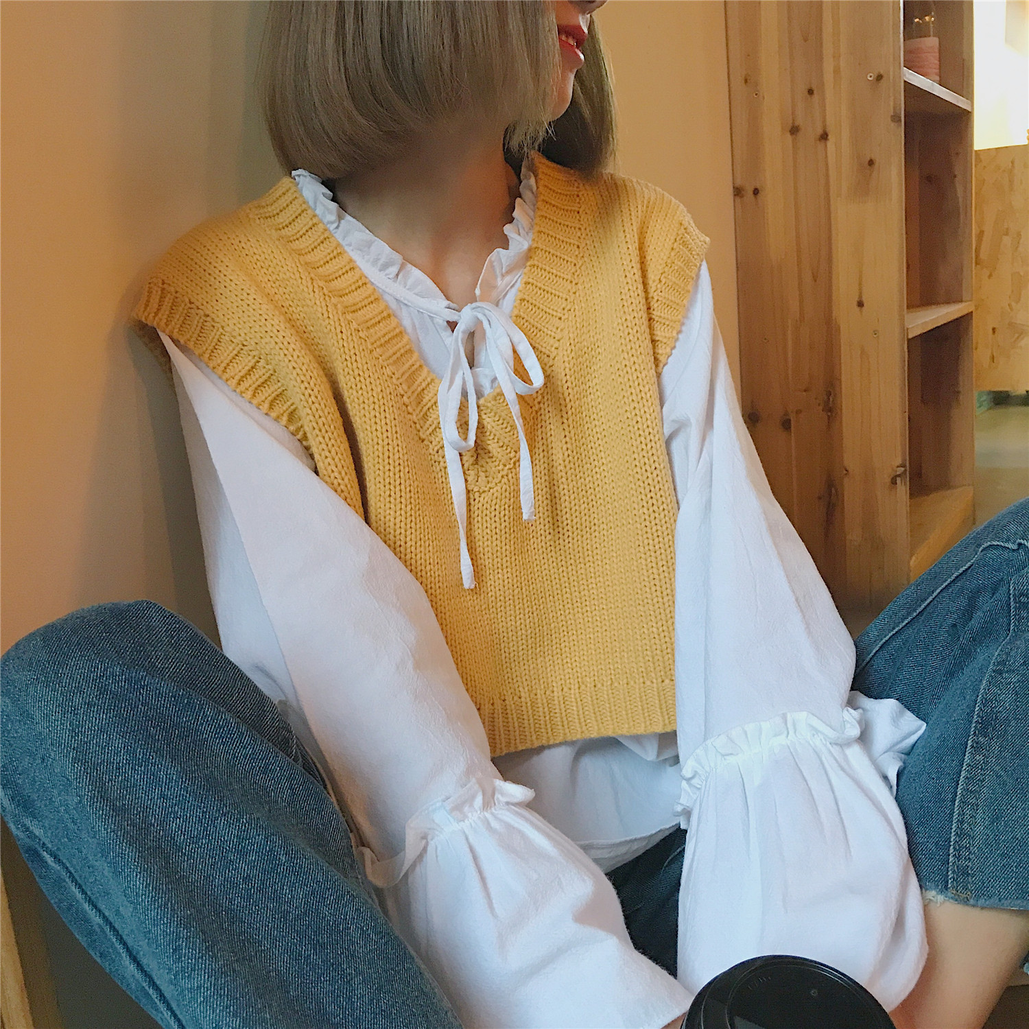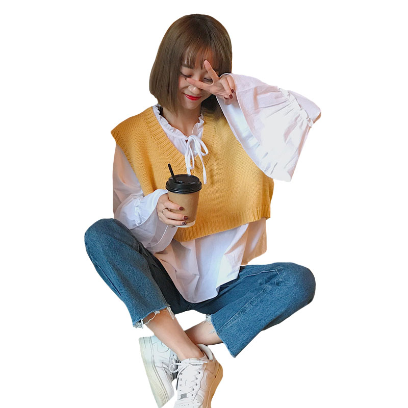 / 韓版時尚休閑套裝秋季女裝短款針織衫馬甲背心+喇叭袖襯衫兩件套