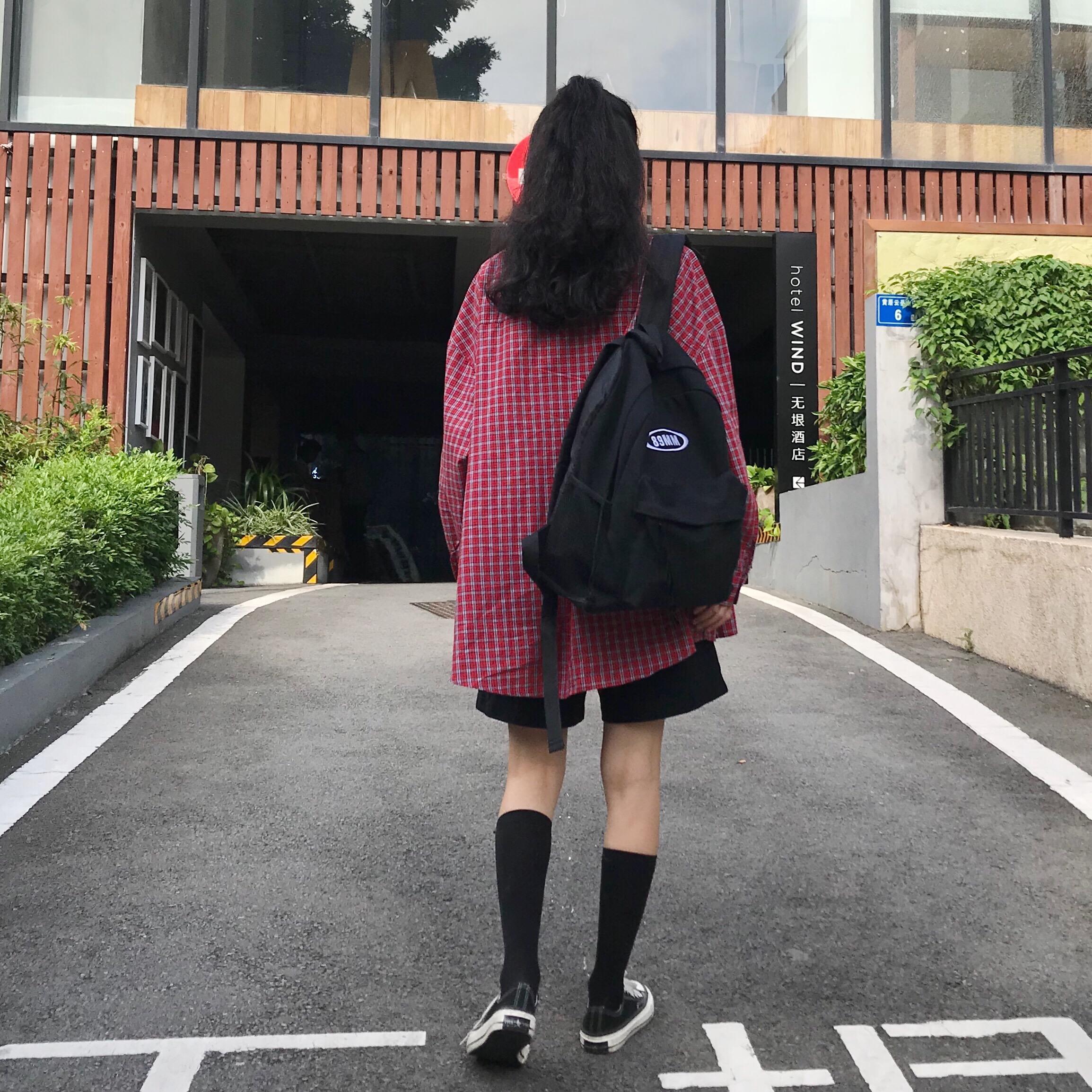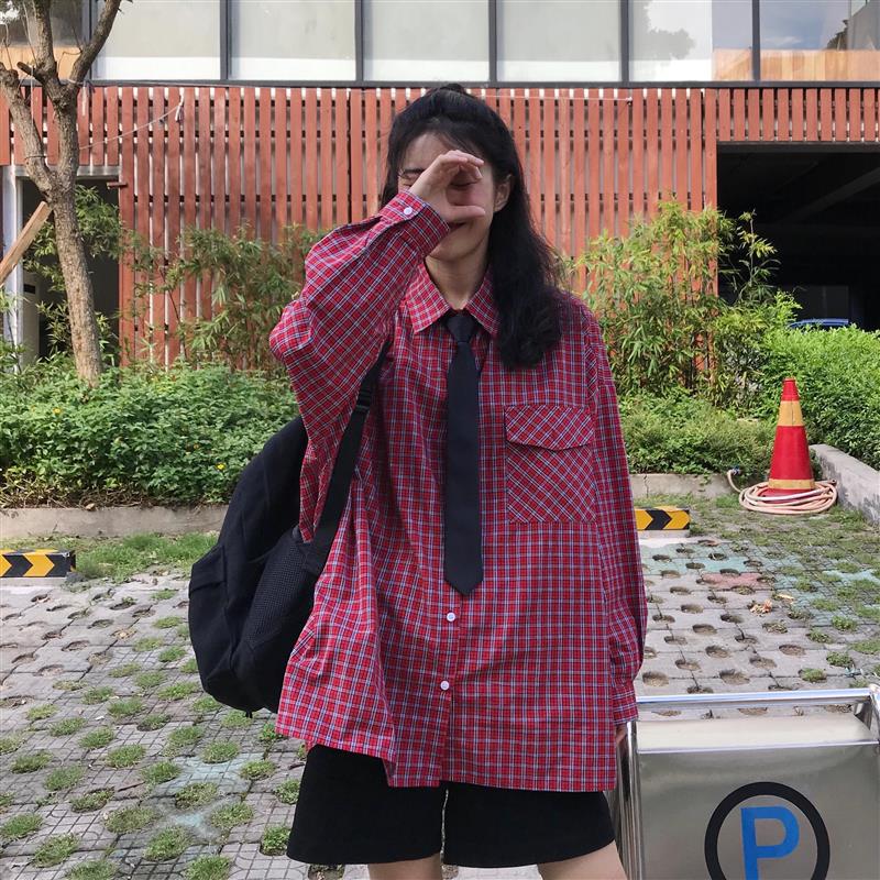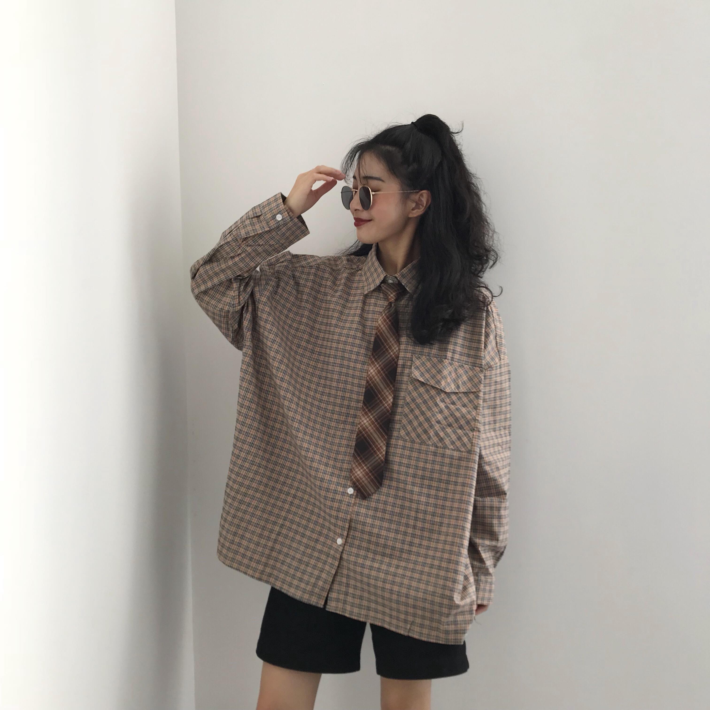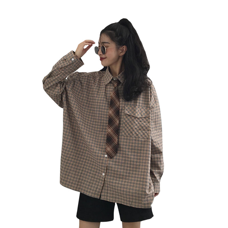 / 夏季女裝韓版寬松百搭格子襯衣中長款長袖休閑顯瘦襯衫上衣帶領帶
