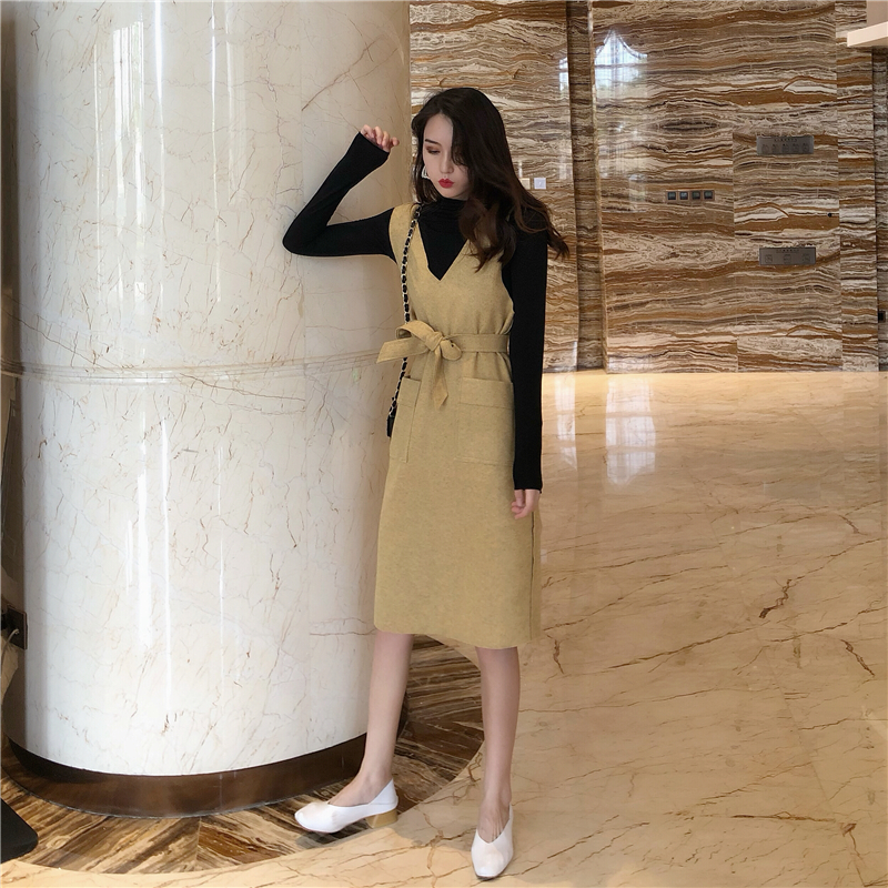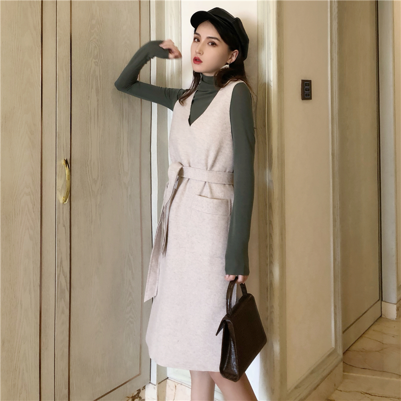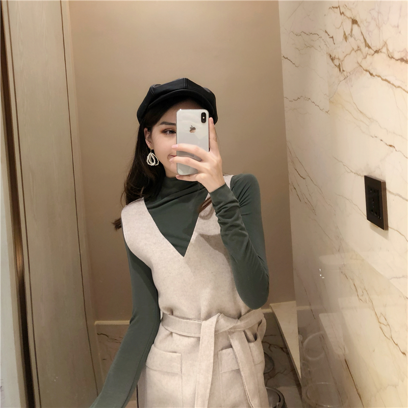 新品毛呢口袋系帶背心連衣裙+簡約純色高領長袖打底衫百搭上衣女
