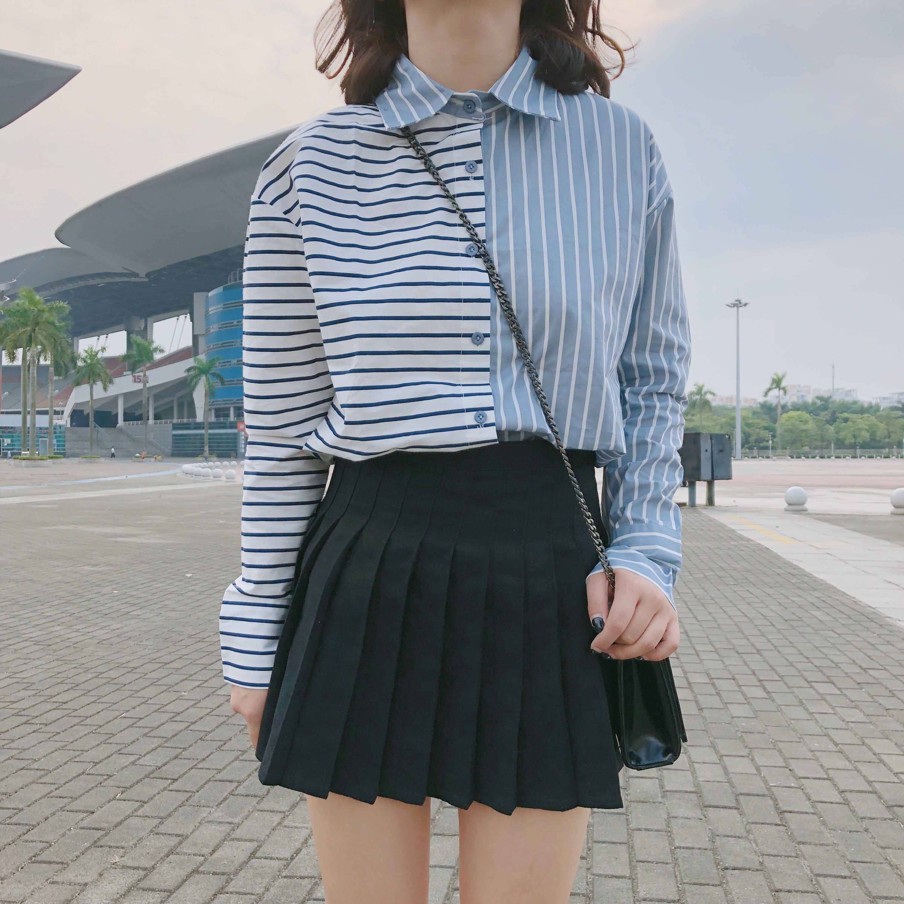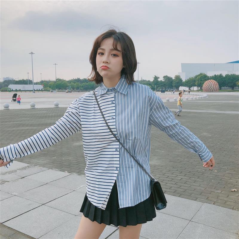 / 早春新款女裝學院風撞色條紋拼接寬松顯瘦學生長袖打底襯衫上衣女