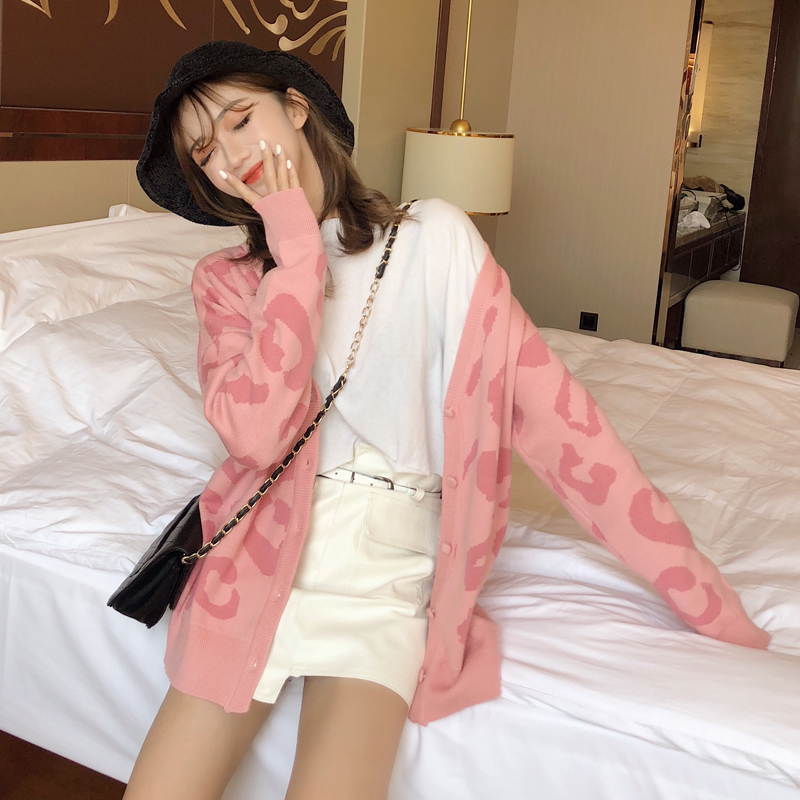 針織衫外套女秋裝2018新款慵懶風寬松撞色豹紋開衫中長款毛衣外搭