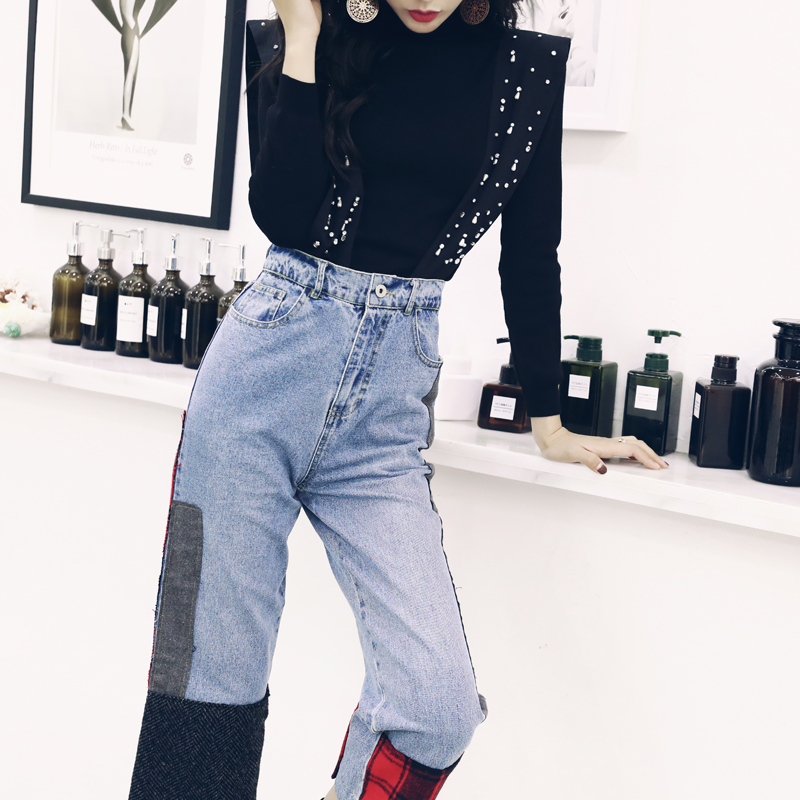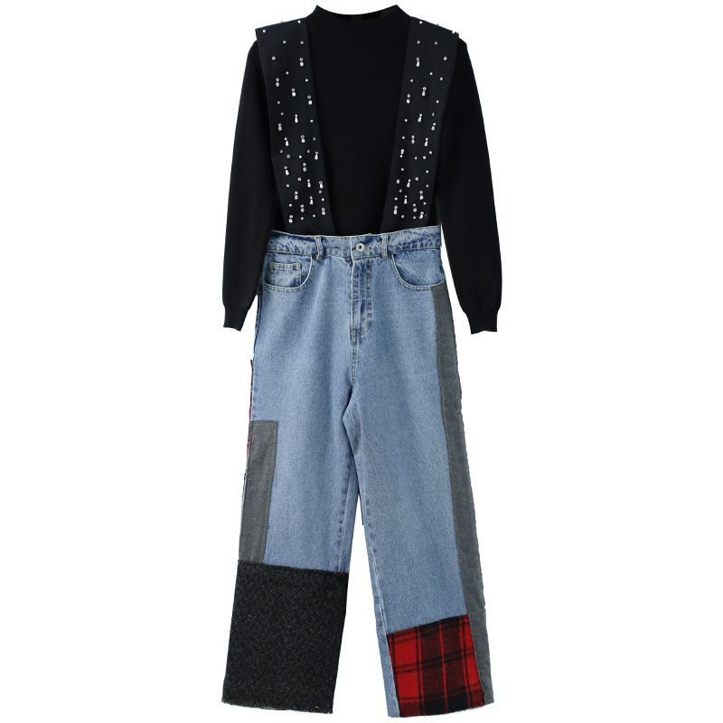 名媛氣質秋裝女2018新款針織衫上衣高腰拼接牛仔背帶褲九分褲套裝