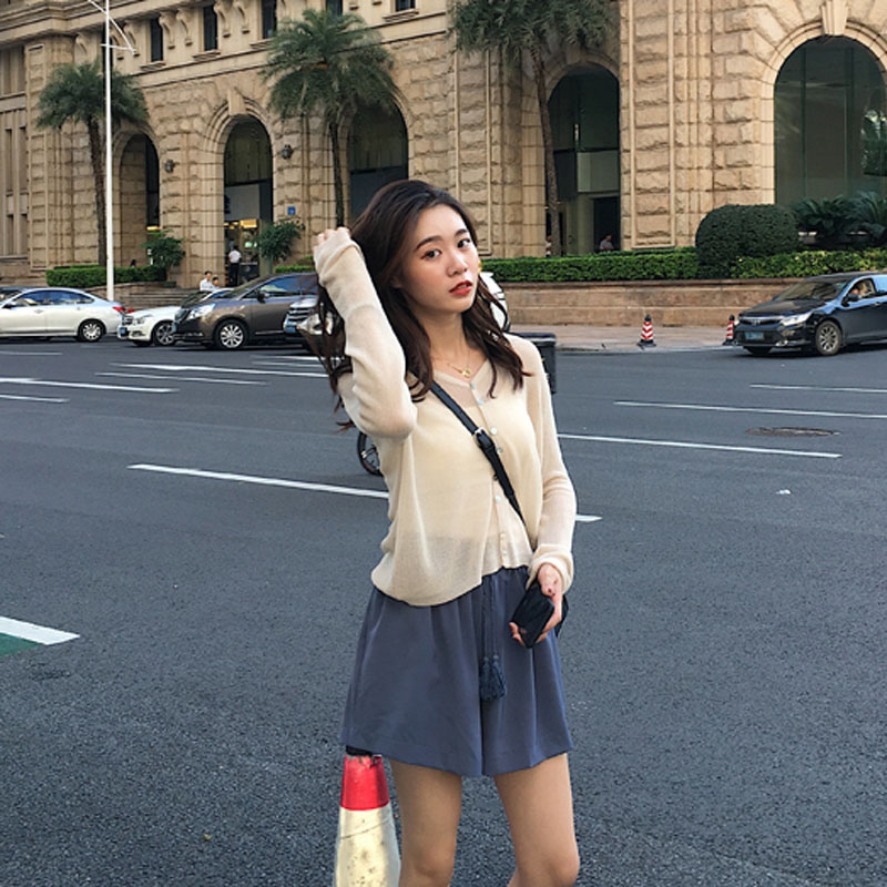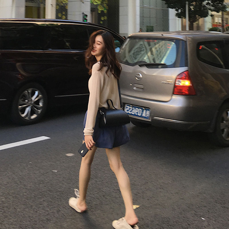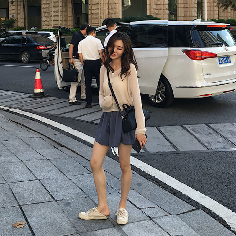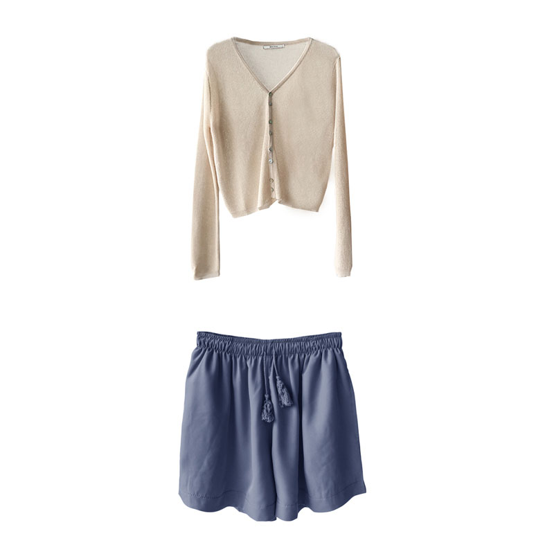 7718杏色上衣+藍灰色短褲