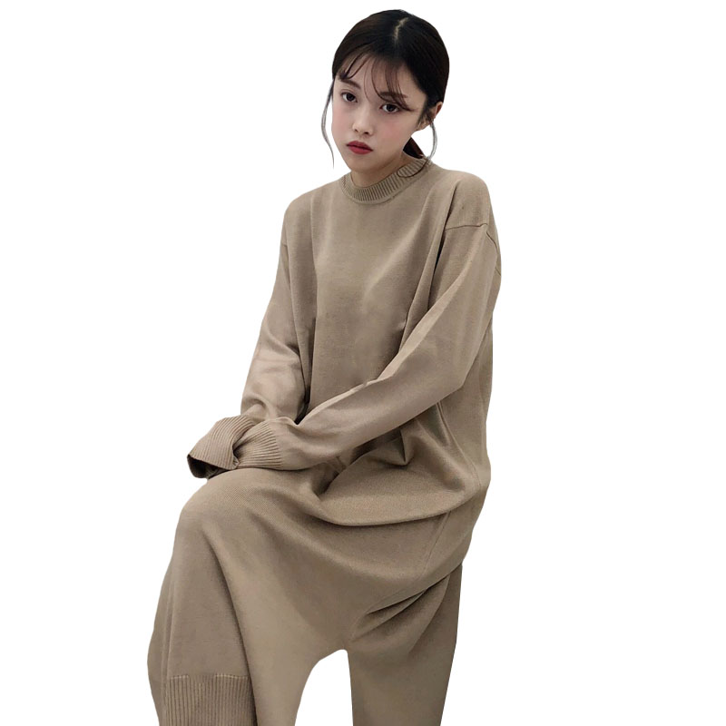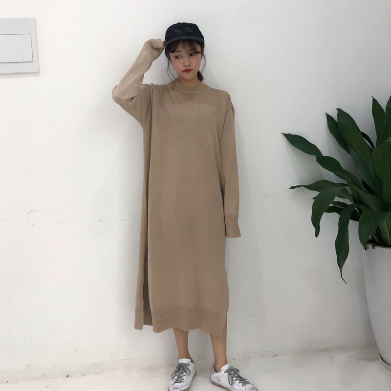 / 秋季女裝韓版中長款慵懶風長袖針織衫寬松外穿套頭開叉毛衣連衣裙
