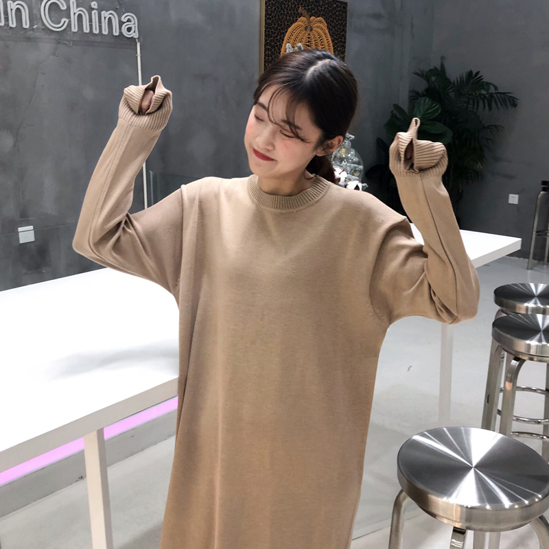 秋季女裝韓版中長款慵懶風長袖針織衫寬松外穿套頭開叉毛衣連衣裙