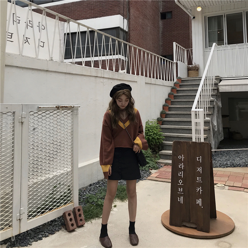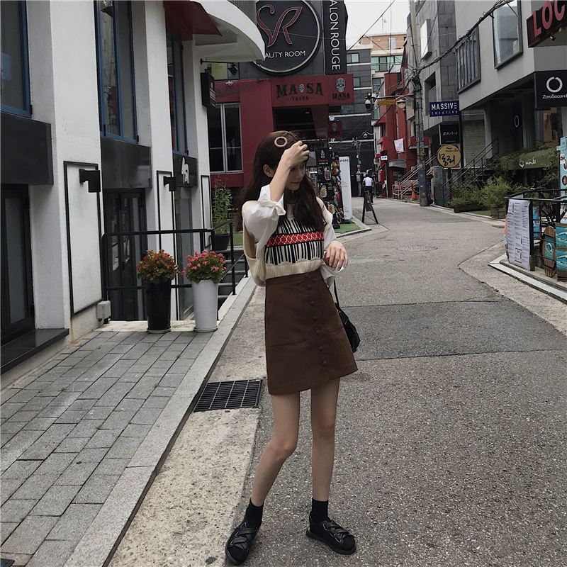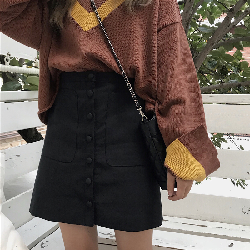 / 秋季女裝韓版高腰一排扣包臀裙半身裙寬松A字裙短裙學生顯瘦裙子