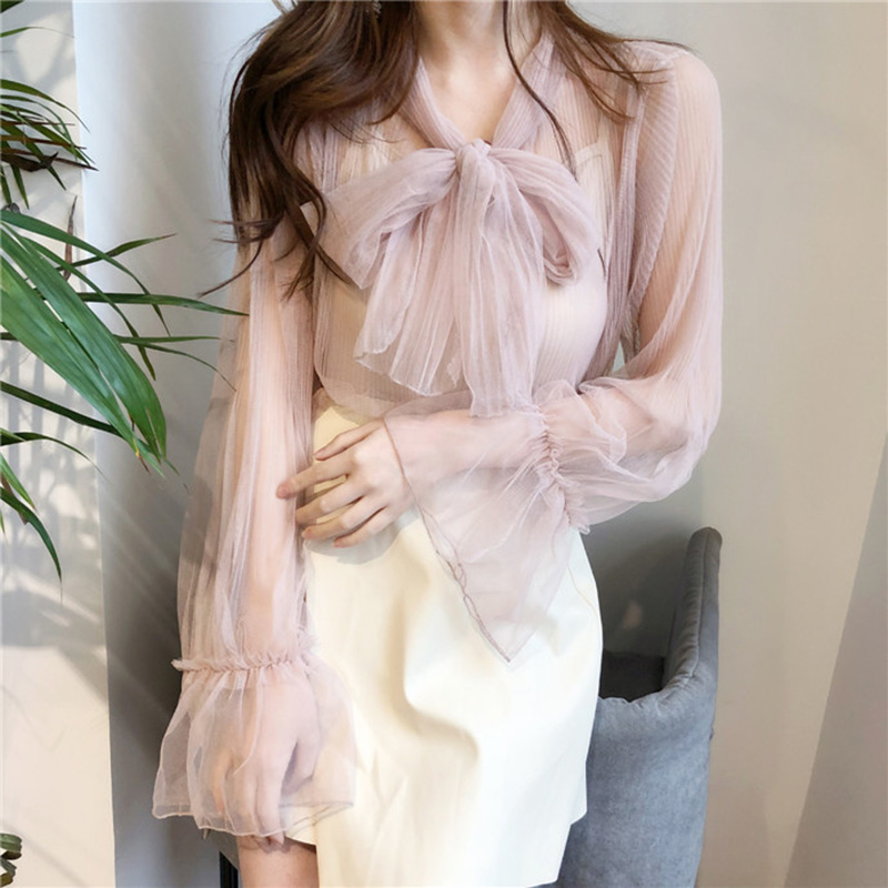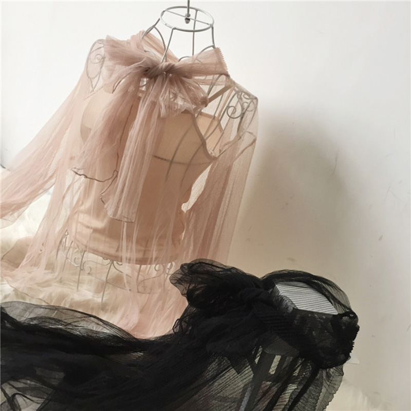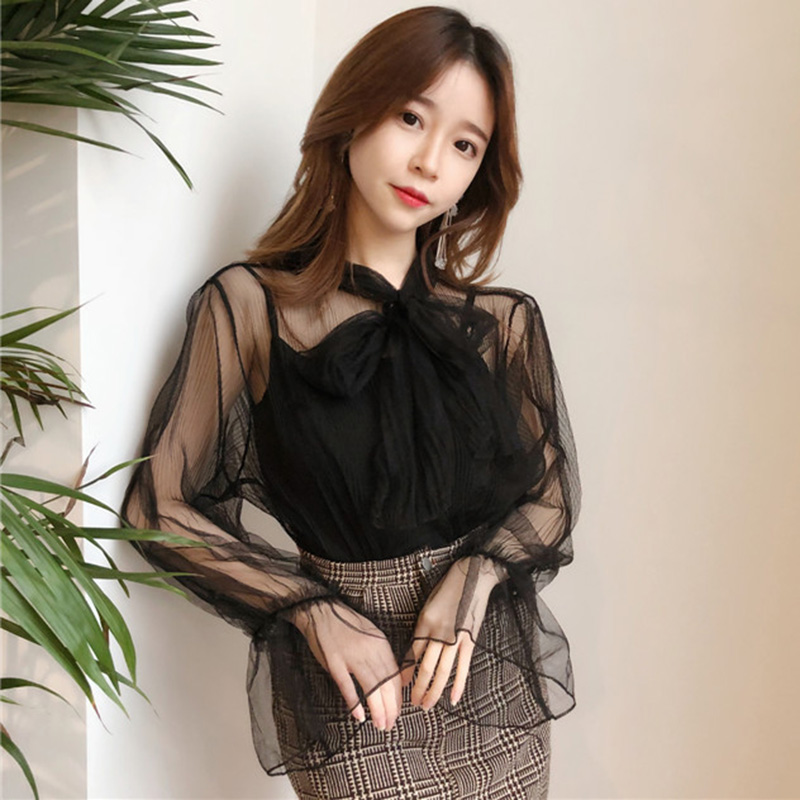 早春新款女裝短款吊帶背心+薄款透視系帶蝴蝶結網紗上衣學生套裝